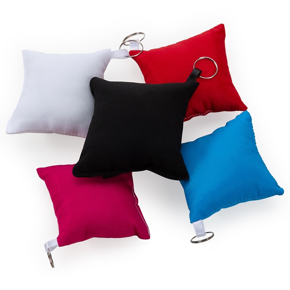 Descrição: Chaveiro almofada confeccionado em tecido de microfibra, enchimento de espuma de silicone com alça de cetim e argola (para chaves).