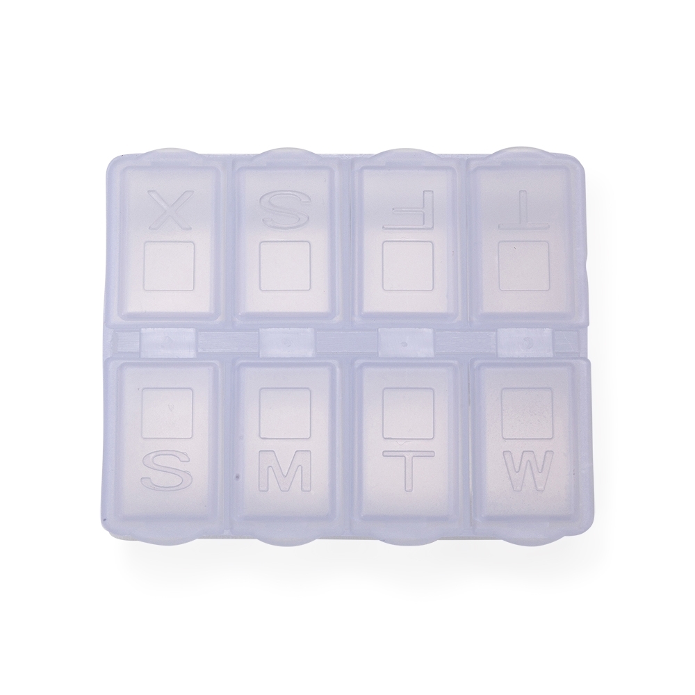 Descrição: Porta comprimido semanal em material plástico. Cada divisória contém a letra inicial referente o dia da semana(em inglês), possui oito divisões sendo a última para comprimido extra.