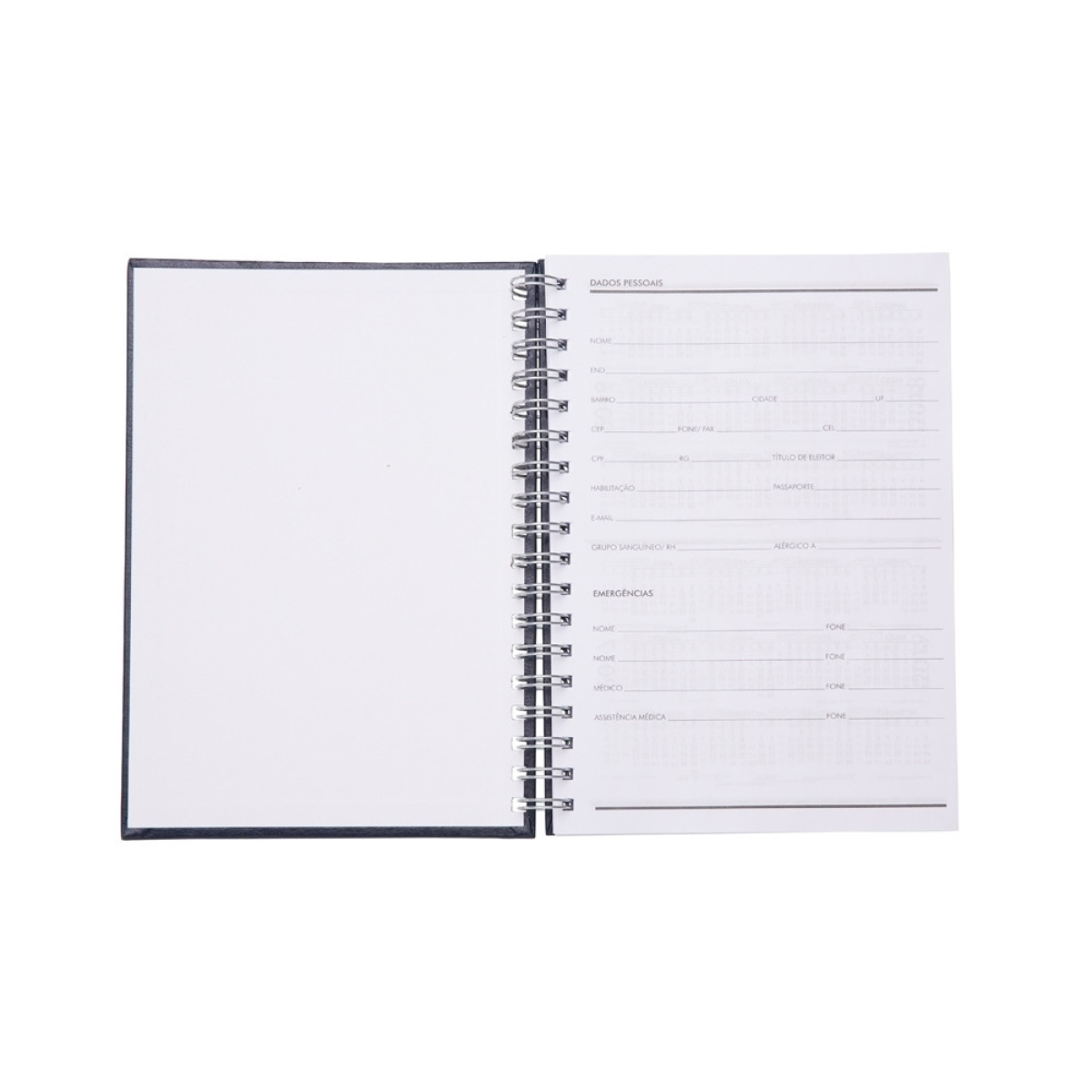Descrição: Caderno com capa de couro sintético texturizado e espiral prata metálico. Possui aproximadamente 100 folhas brancas pautadas e páginas para: dados pessoais, calendário de 2023 à 2026 e planejamento.