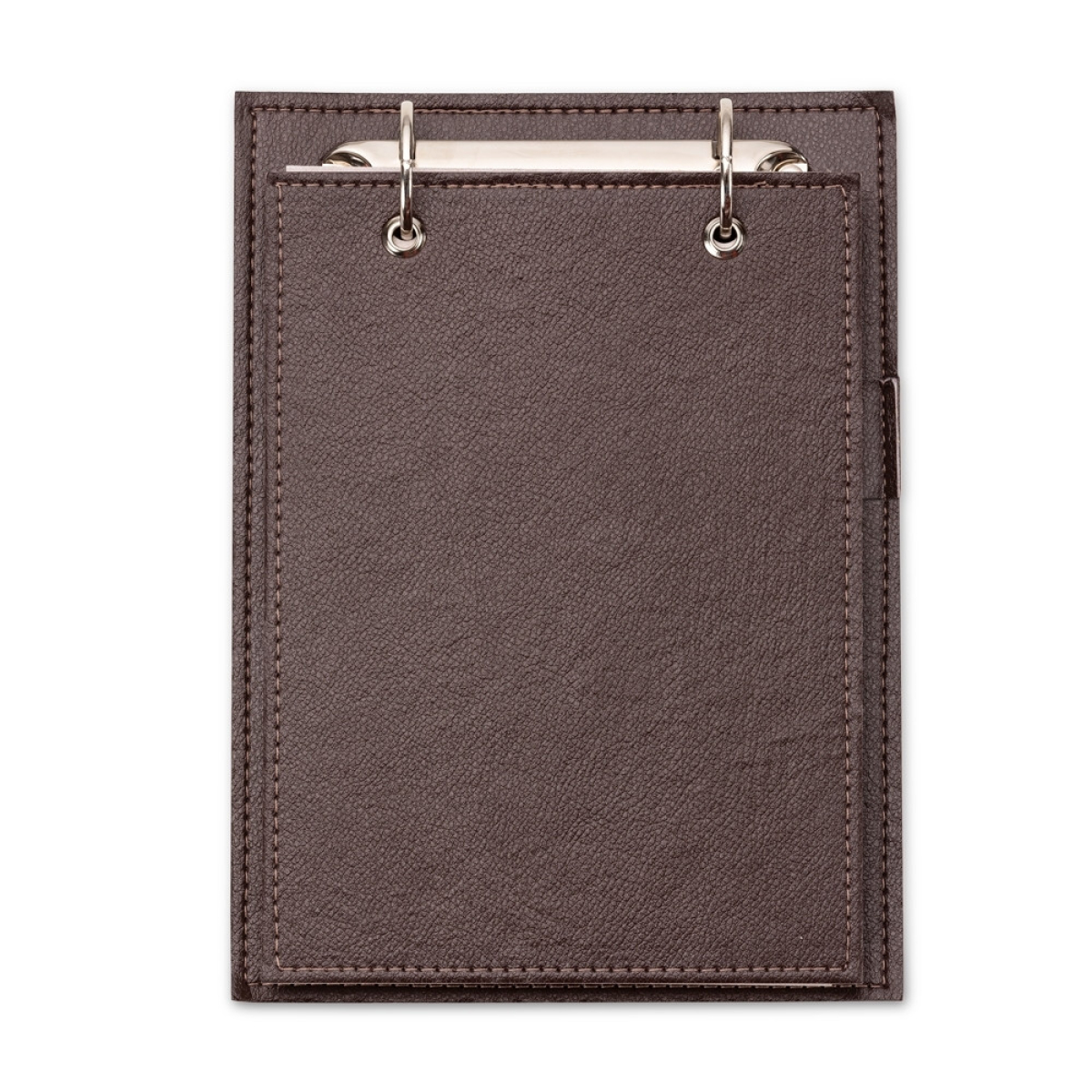 Descrição: Bloco de anotações de mesa com trilho de ferro, capa em couro sintético. Possui suporte na lateral interna para colocar caneta (não acompanha) e aproximadamente 96 folhas recicladas com área destacável.