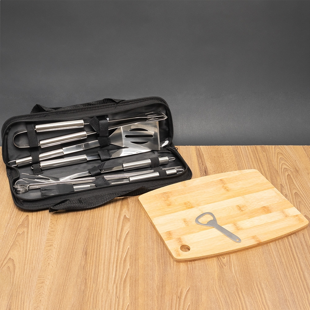 Descrição: Eleve o churrasco do papai a outro nível! Apresentamos o kit pai churrasqueiro, perfeito para os pais que adoram comandar a grelha e preparar refeições deliciosas. Este kit especial inclui 1 conjunto completo de utensílios para churrasco, 1 tábua de bambu resistente, ideal para preservar o fio de corte das facas, e 1 abridor de garrafas metálico para abrir as bebidas com facilidade enquanto a festa rola.