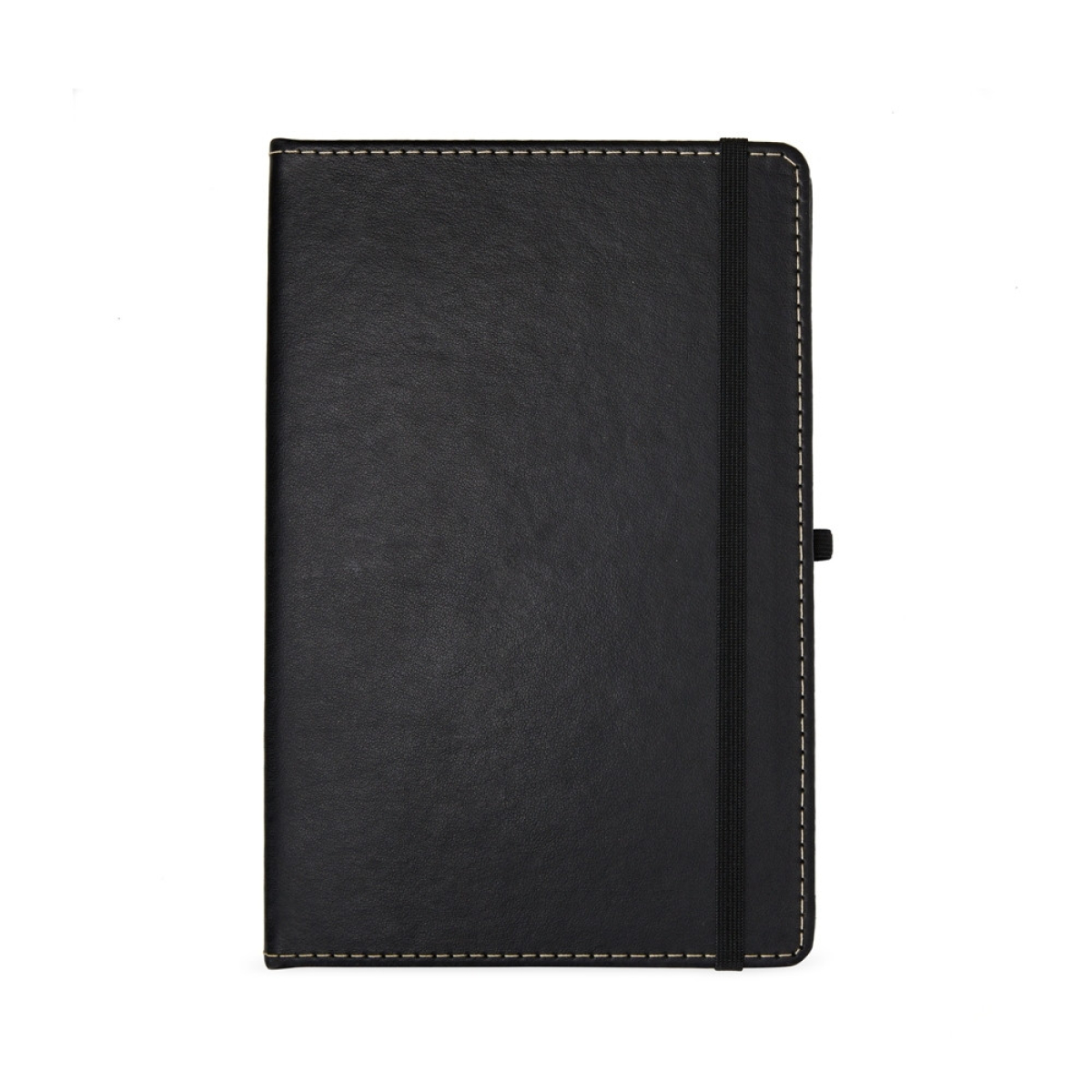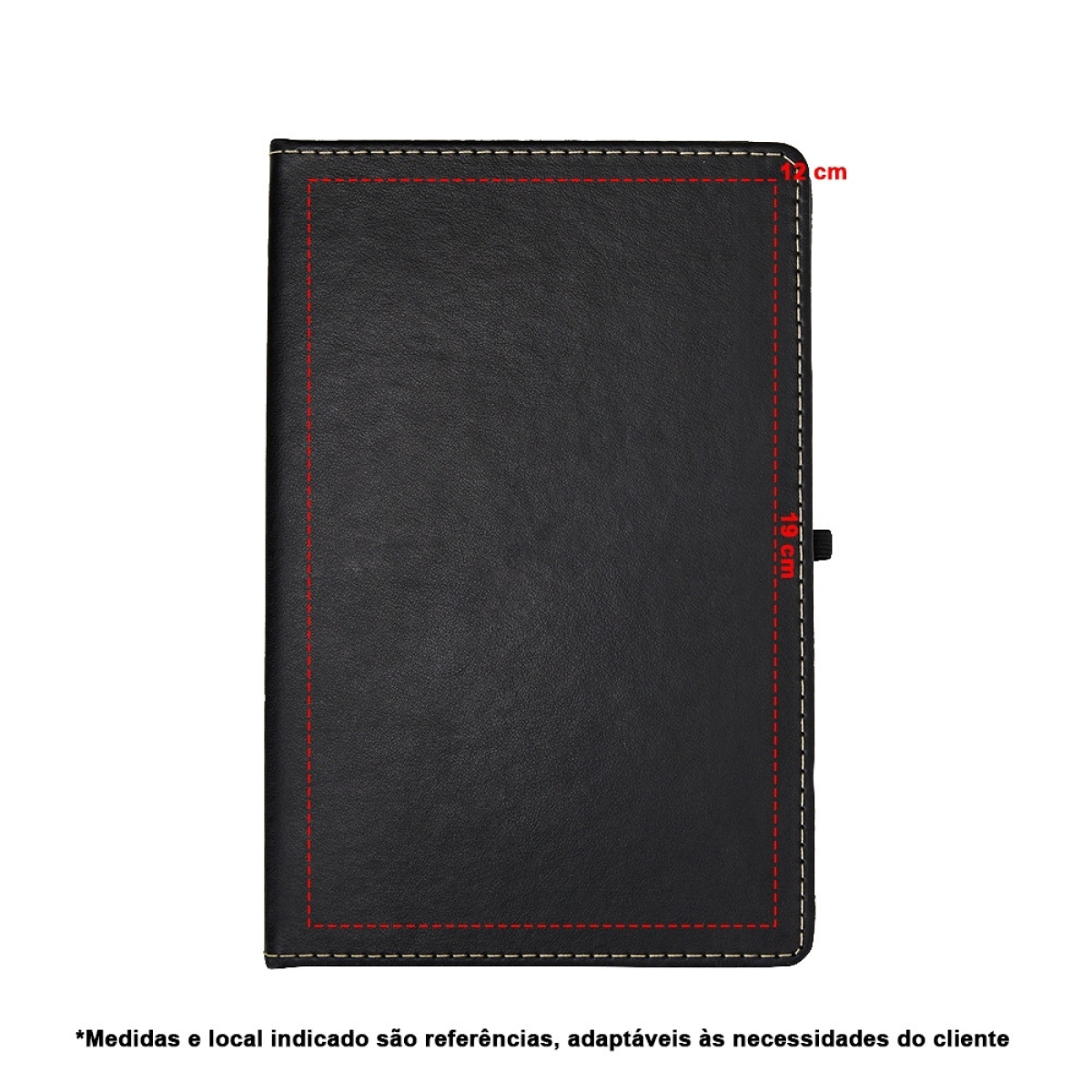Descrição: Caderneta em couro sintético com porta caneta, marca página em cetim e elástico para fecho. Contém aproximadamente 80 folhas brancas com pauta.