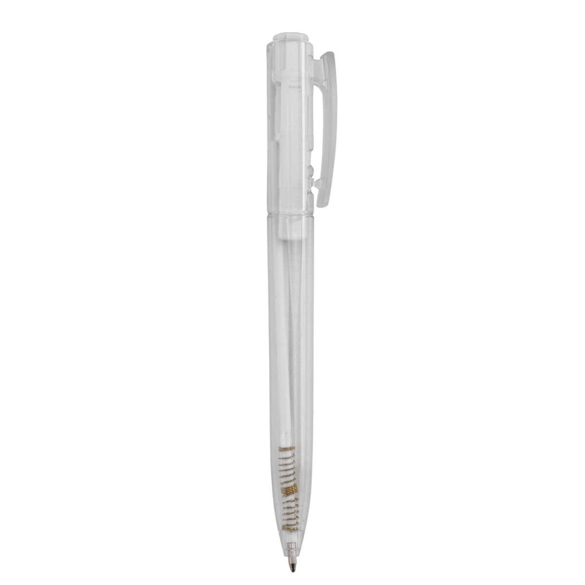 Descrição: Caneta plástica com carga esferográfica azul e acionamento por clique.