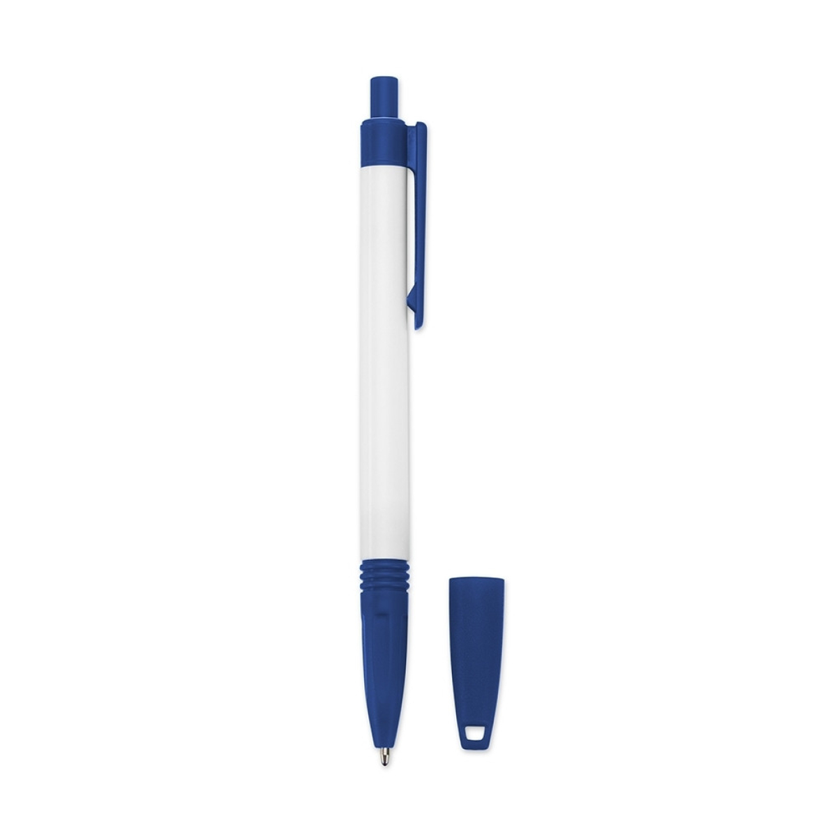 Descrição: Caneta plástica com carga esferográfica azul e acionamento por clique. Acompanha cordão de poliéster com tampa para encaixe da caneta.