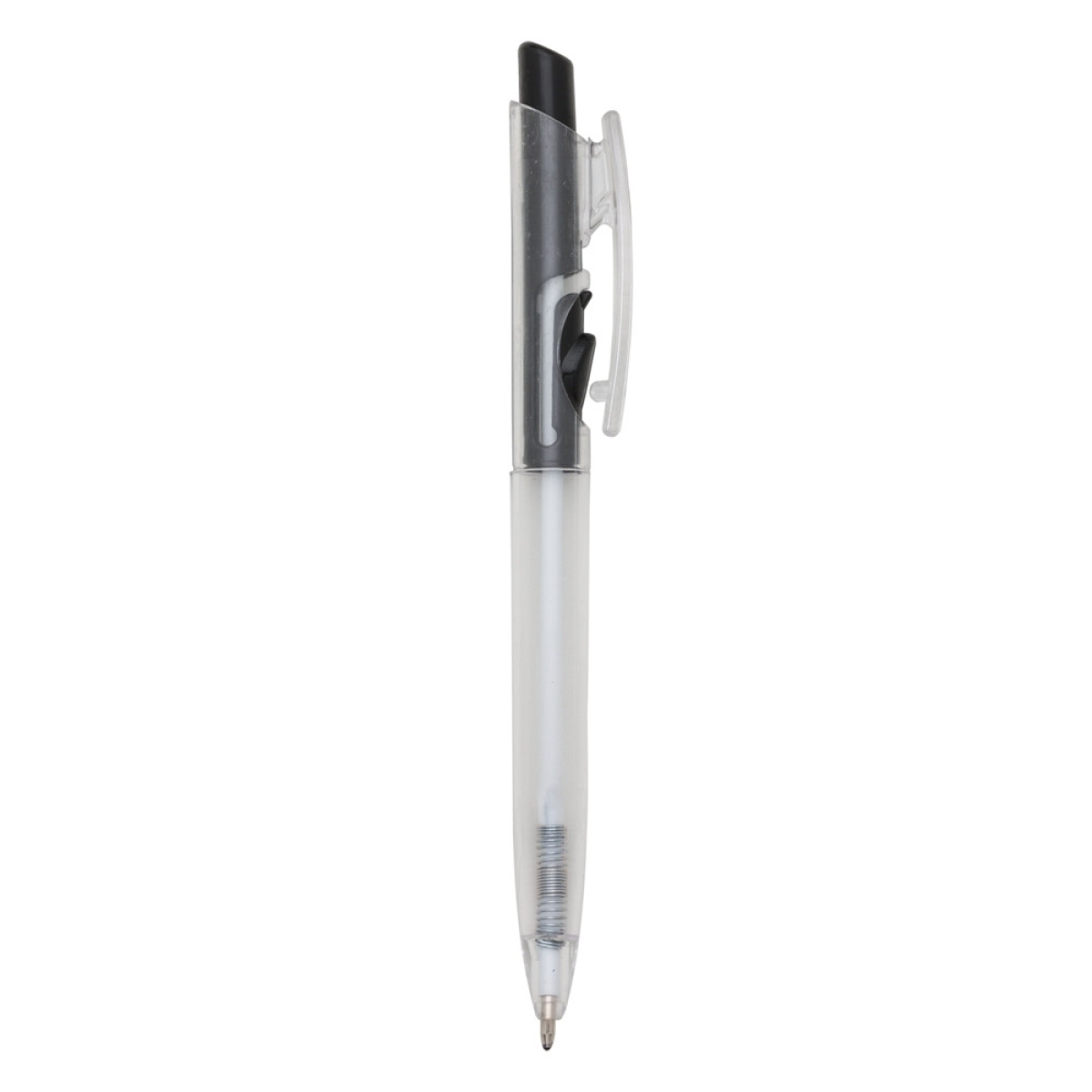 Descrição: Caneta plástica com carga esferográfica azul e acionamento por clique.