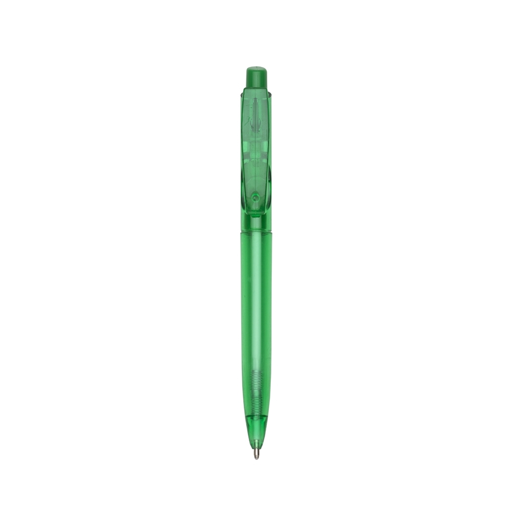 Descrição: Caneta plástica com carga esferográfica azul e acionamento por clique.