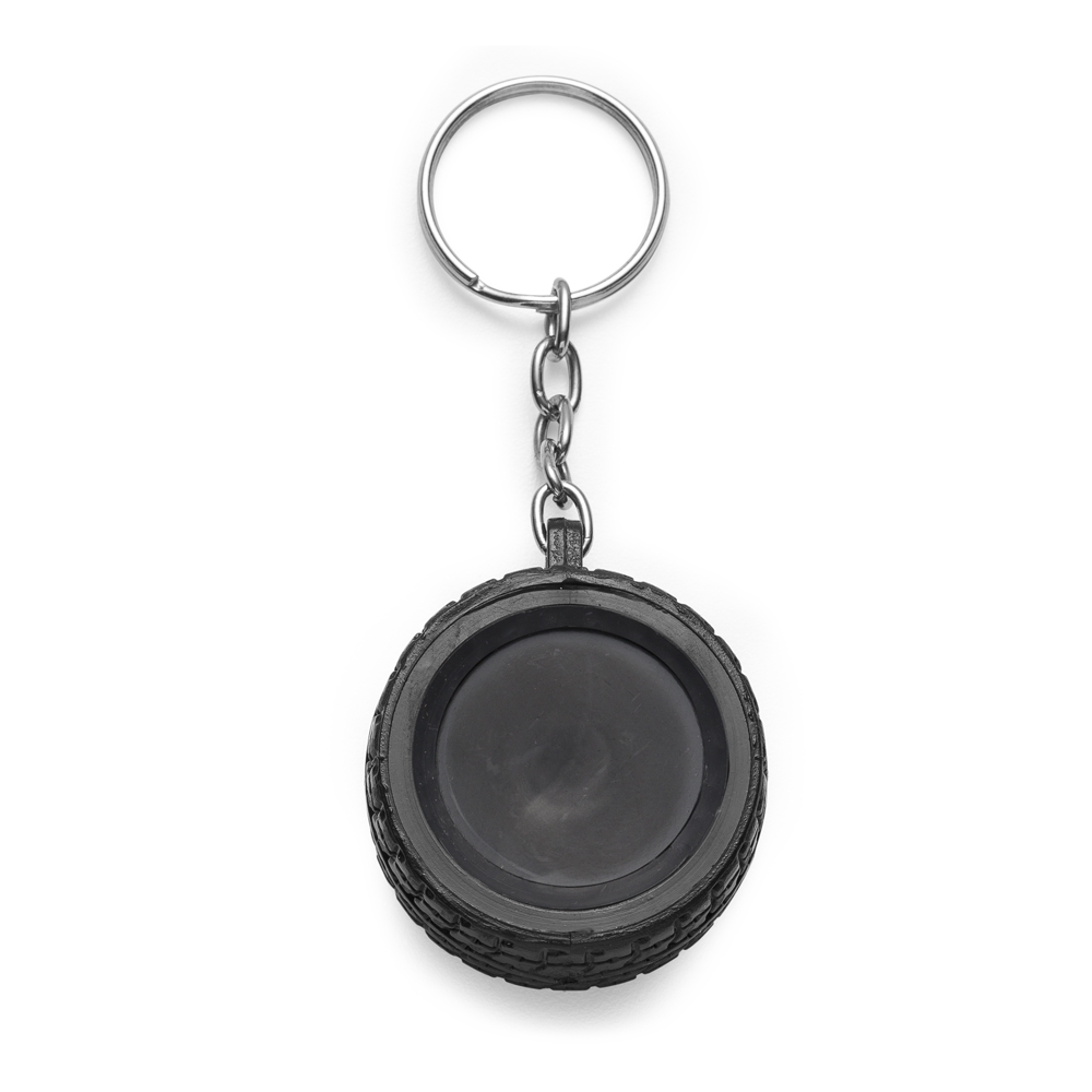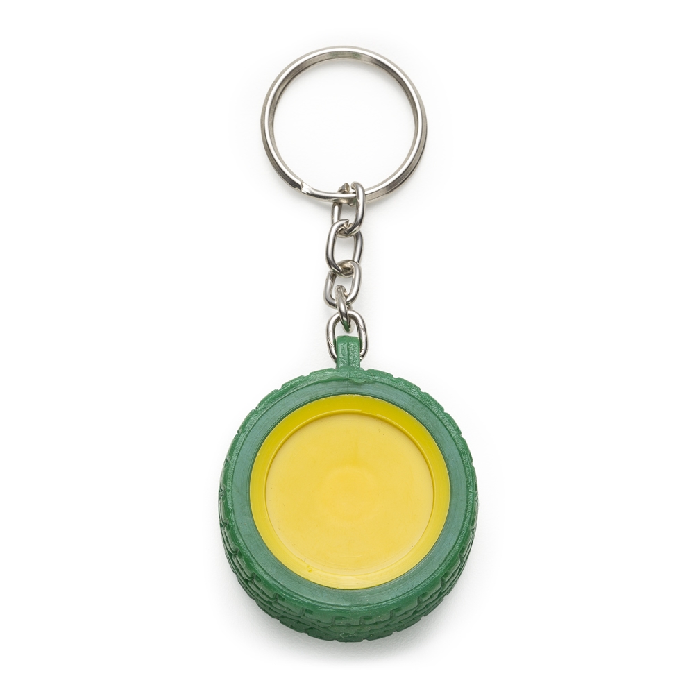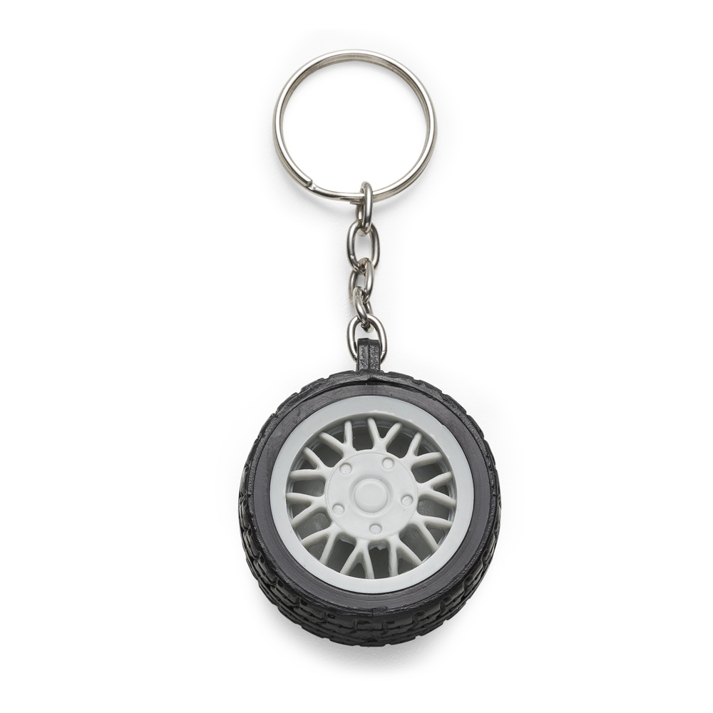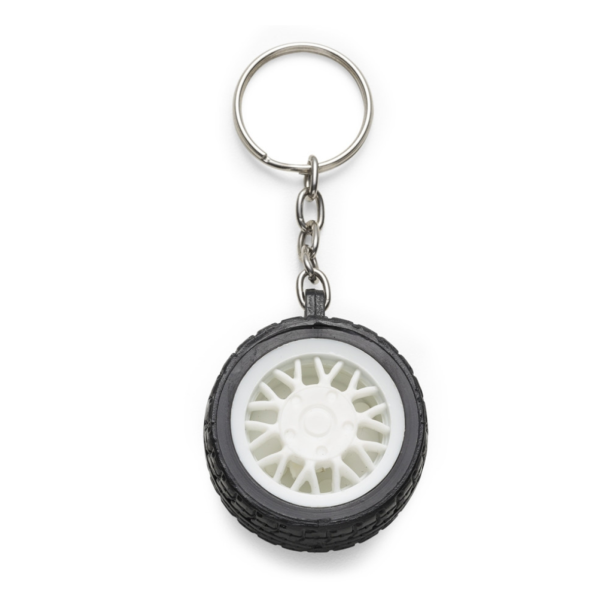 Descrição: Chaveiro plástico formato pneu, aro detalhado plástico colorido de um lado e lado inverso liso(possível aplicar resina). Pneu emborrachado.