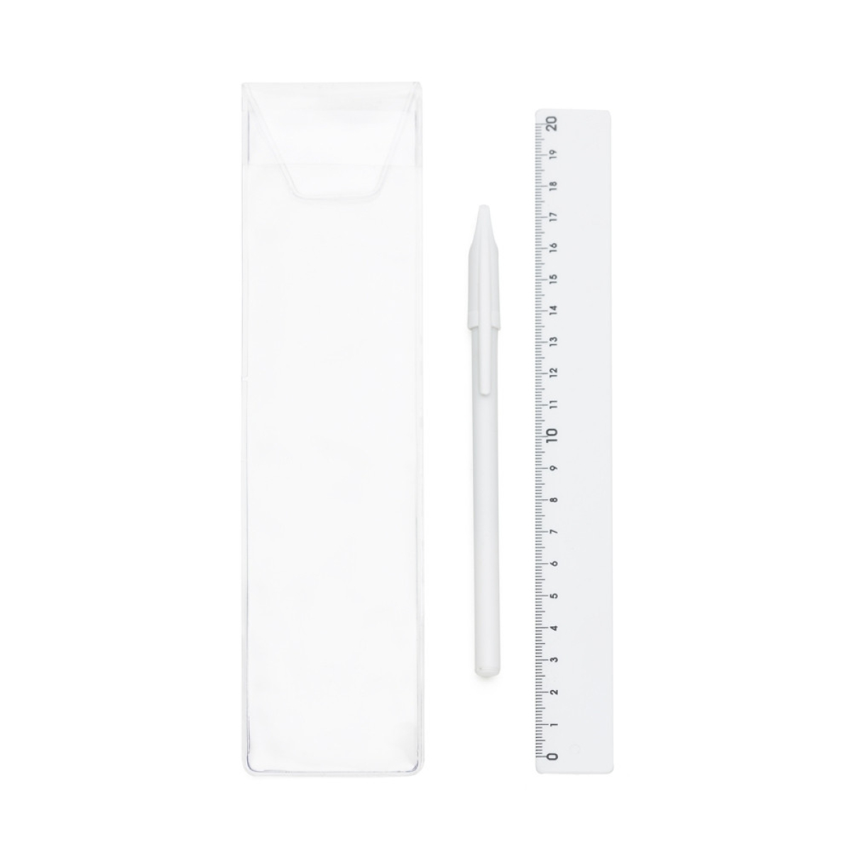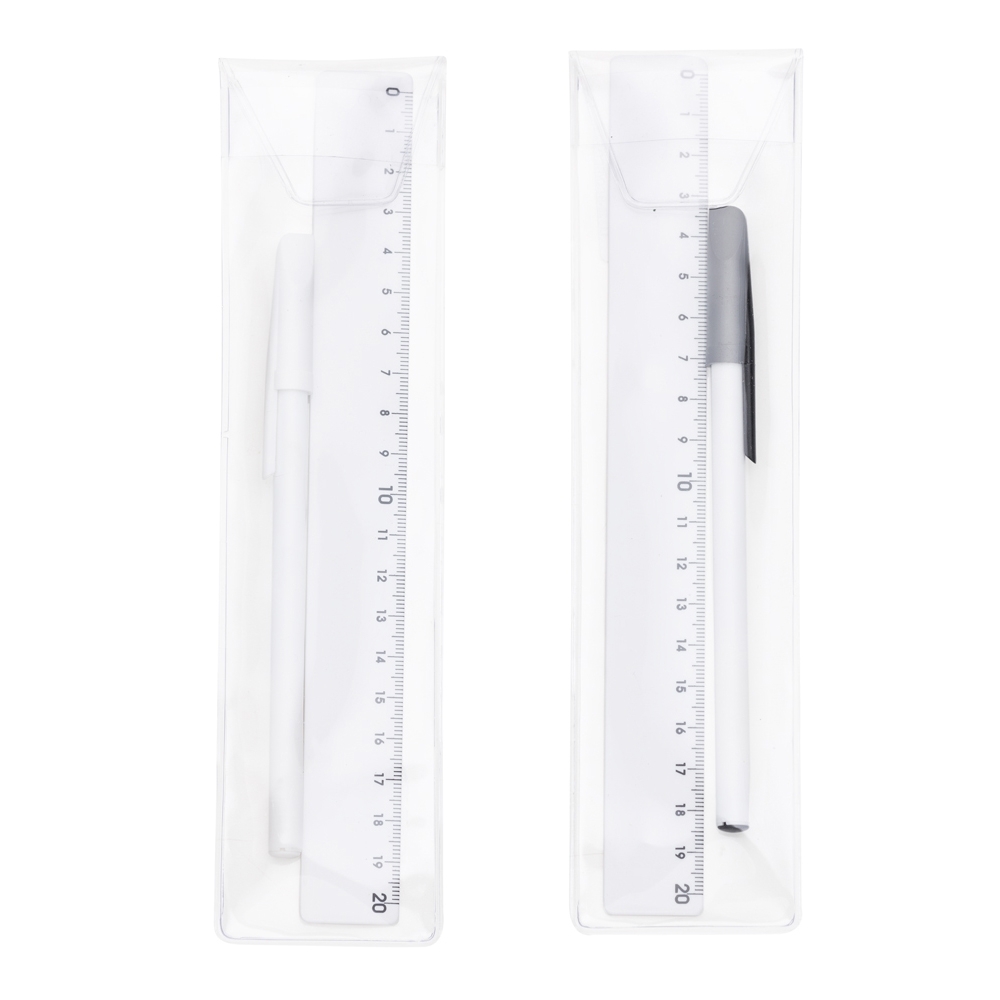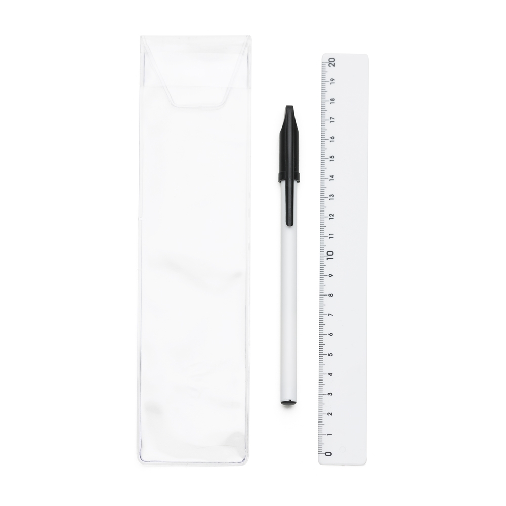 Descrição: Kit régua e caneta plástica em estojo plástico transparente. Caneta simples com tampa e régua de 20cm.