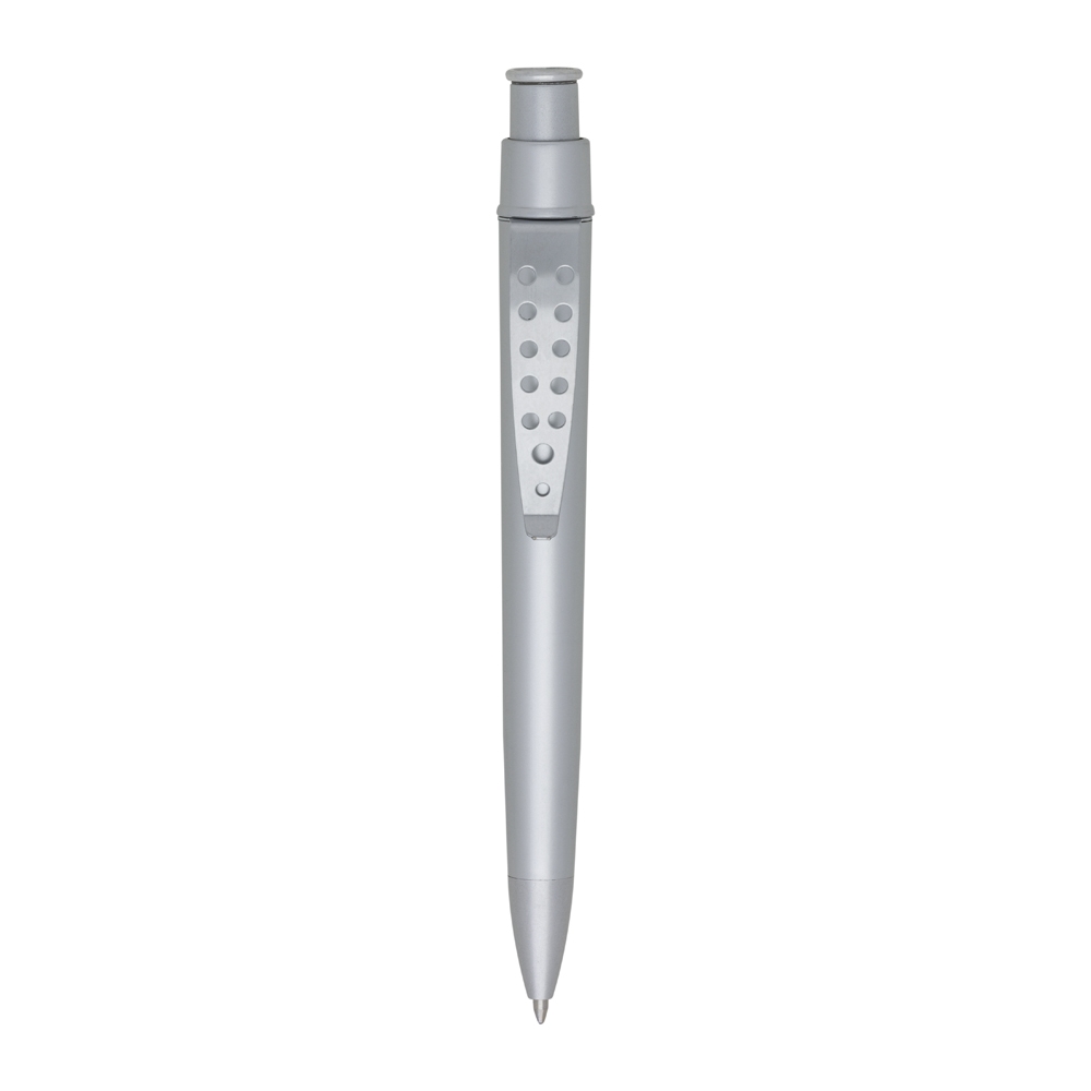 Descrição: Caneta plástica com clip metálico vazado, carga esferográfica azul e acionamento por clique.