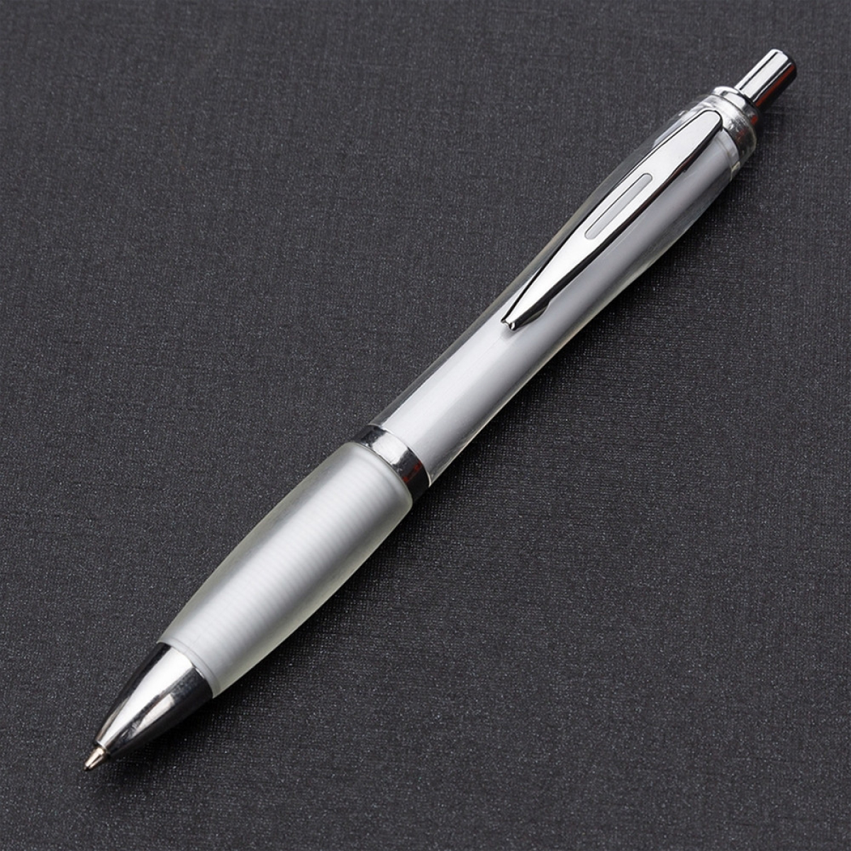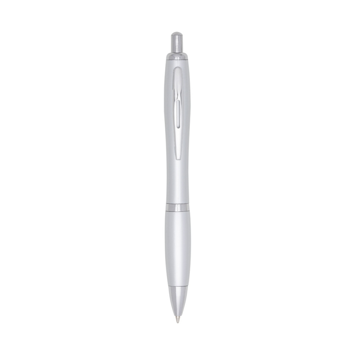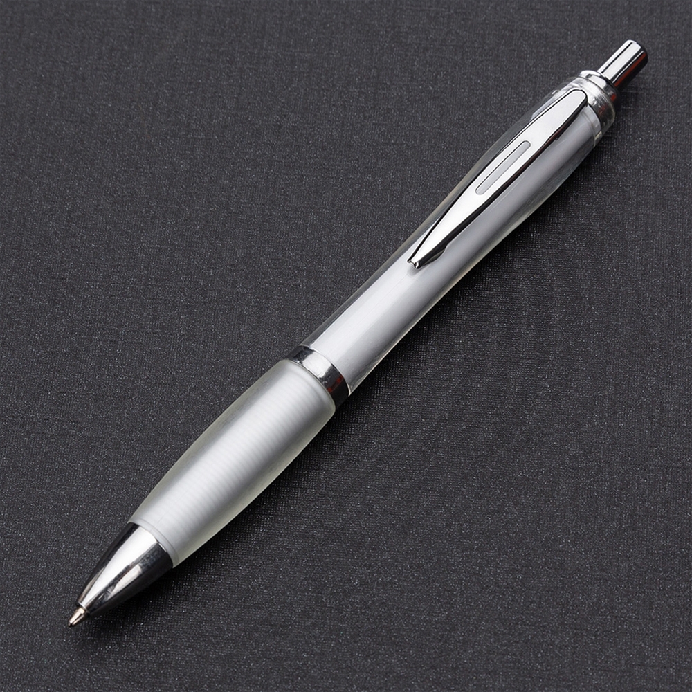 Descrição: Caneta plástica com detalhe emborrachado, carga esferográfica azul e acionamento por clique.