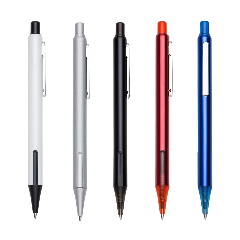 Descrição: Caneta semimetálica com carga esferográfica azul e acionamento por clique. OBS.: PEDIDO APENAS MÚLTIPLO DE 50 PEÇAS!