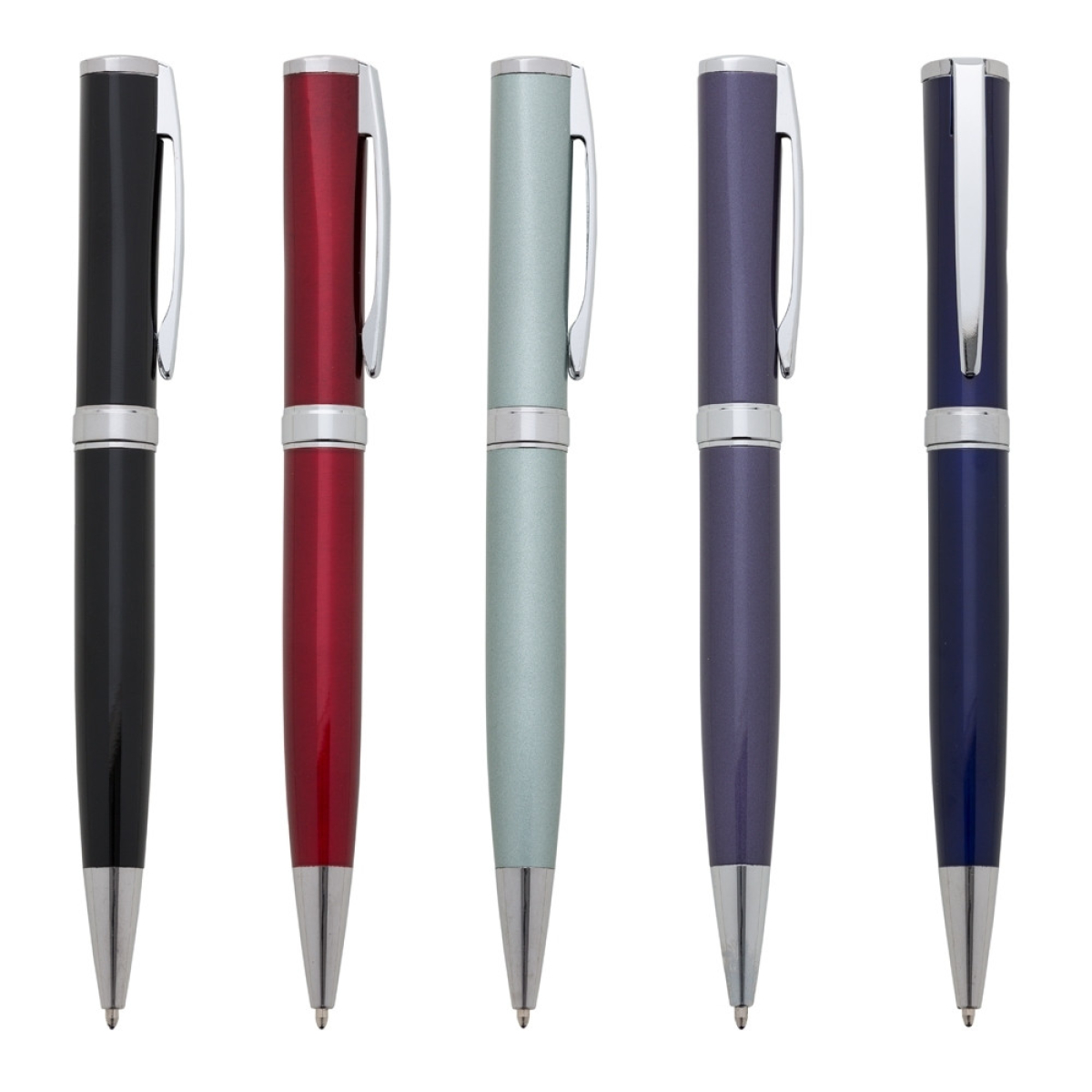 Descrição: Caneta metálica com carga esferográfica azul e acionamento por rotação.