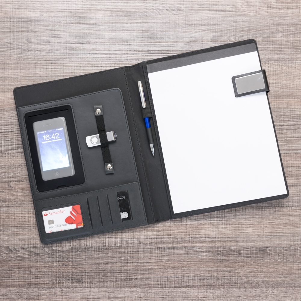 Descrição: Pasta convenção de couro sintético com trava de imã lateral, possui uma placa de metal na trava ideal para personalização. Possui “bolso” para arquivar documentos, porta celular com visor fosco, porta cartões com divisórias e visor além de um bolso atrás, suporte elástico para caneta(não acompanha) e bloco A4 com aproximadamente 20 folhas brancas pautadas de verso liso.