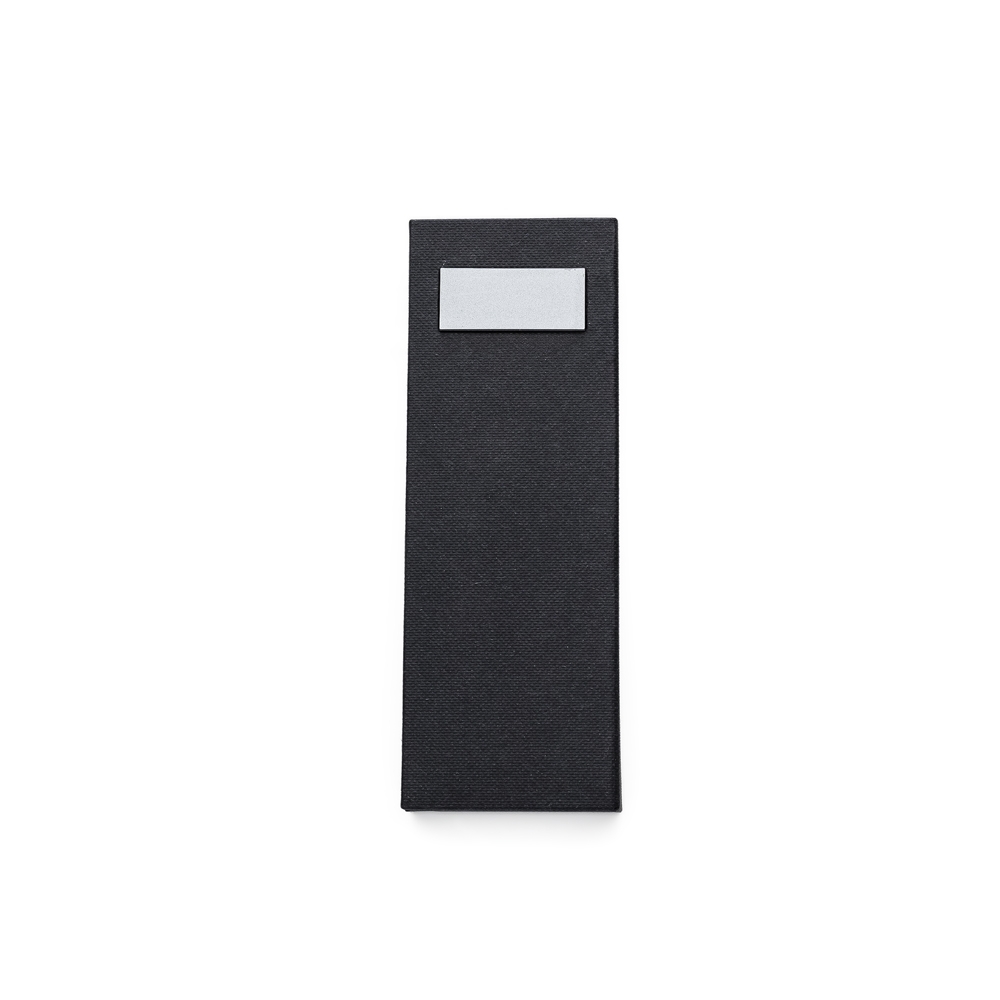Descrição: Estojo de papel para duas canetas. Capa de papel texturizado com placa plástica para personalização, estojo revestido com veludo.