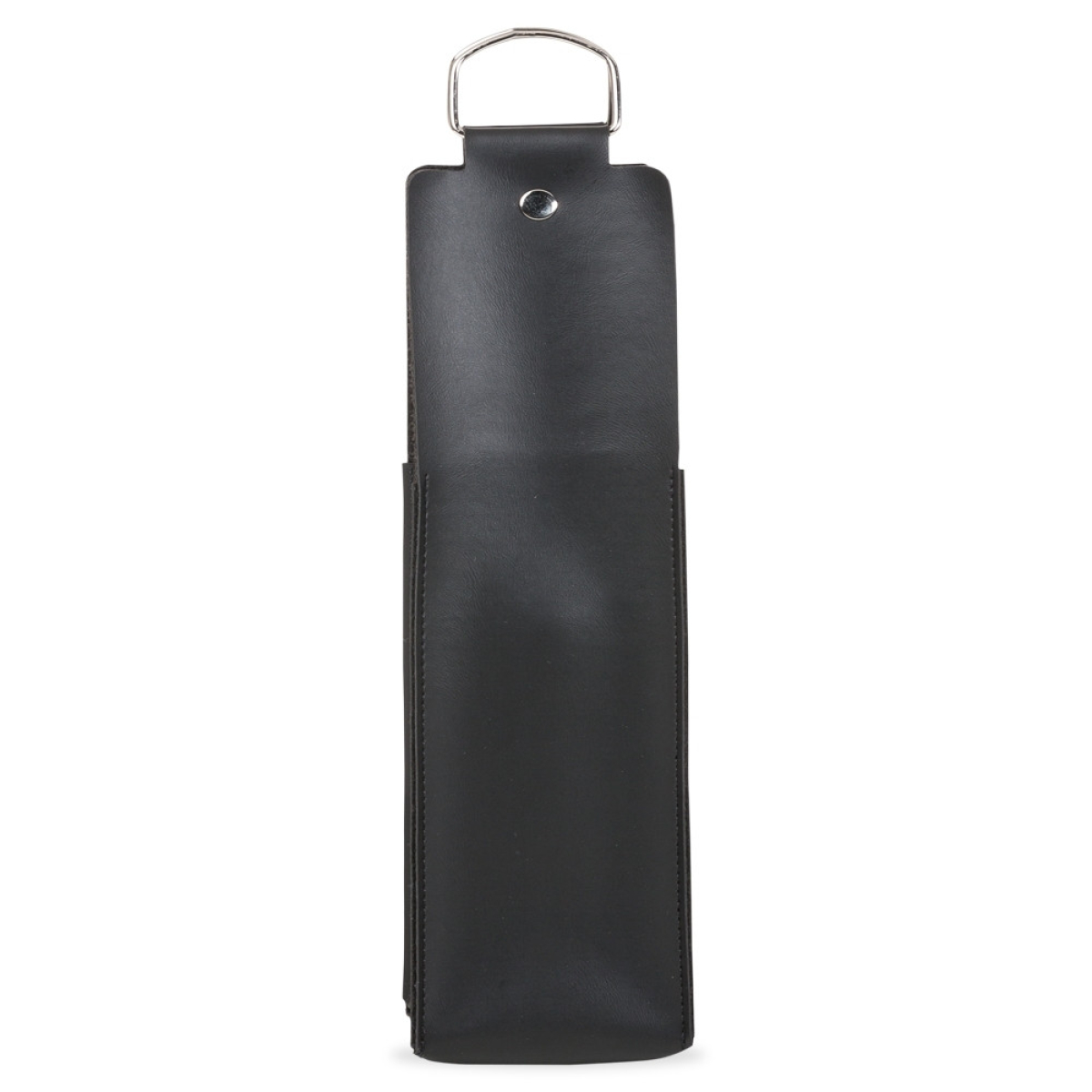 Descrição: Estojo porta vinho em couro sintético bidim, contém duas alças metálicas e botão para lacre.