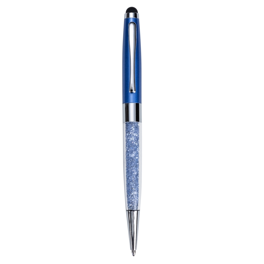 Descrição: Caneta metálica com touch screen e detalhes em cristal, carga esferográfica azul e acionamento por rotação. OBS.: PEDIDO APENAS MÚLTIPLO DE 50 PEÇAS!
