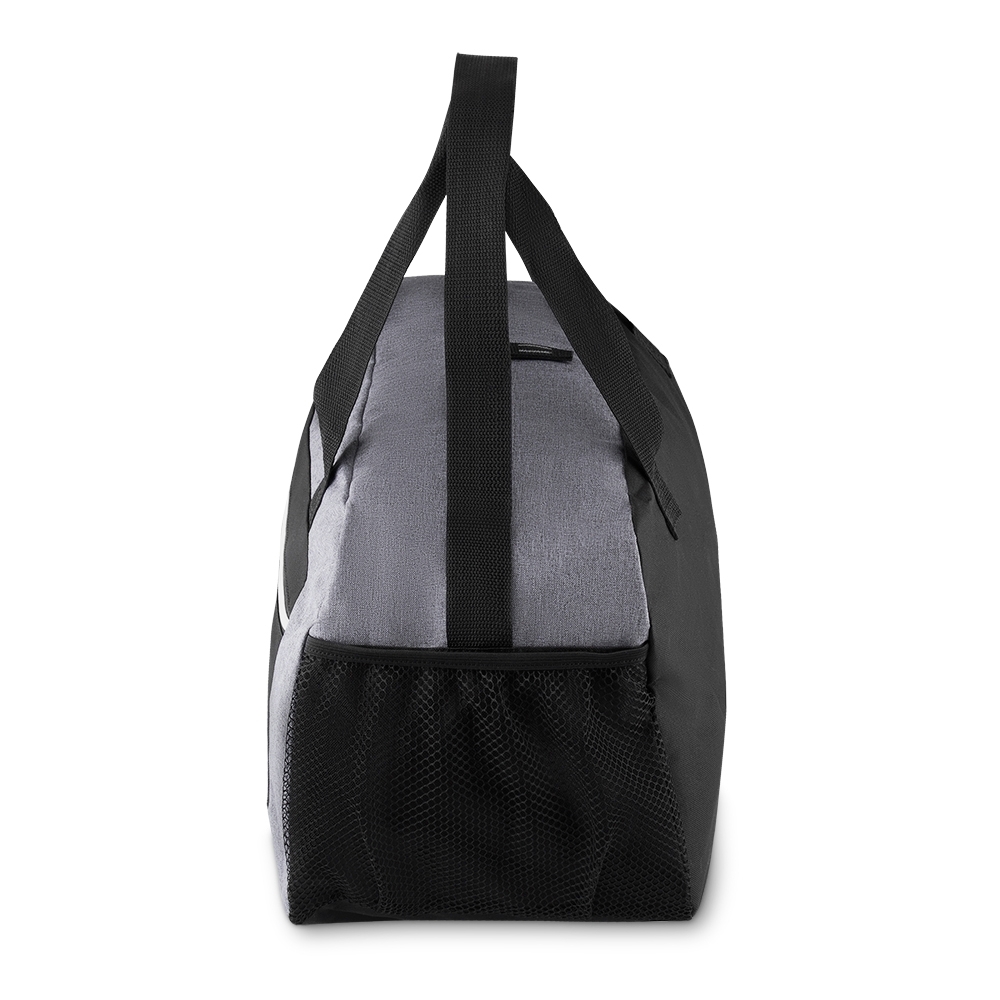 Descrição: Bolsa esportiva de poliéster. Possui alça de mão com pegador cinza de velcro, alça ajustável para as costas e bolsos laterais de malha.
