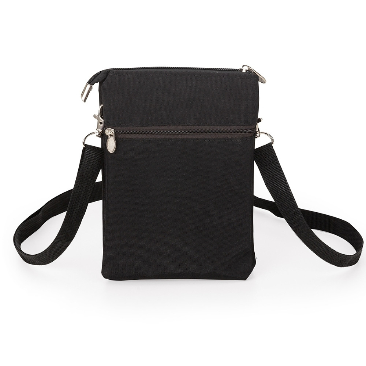 Descrição: Bolsa de ombro em nylon resistente à água com três compartimentos e plaquinha personalizável em couro sintético.