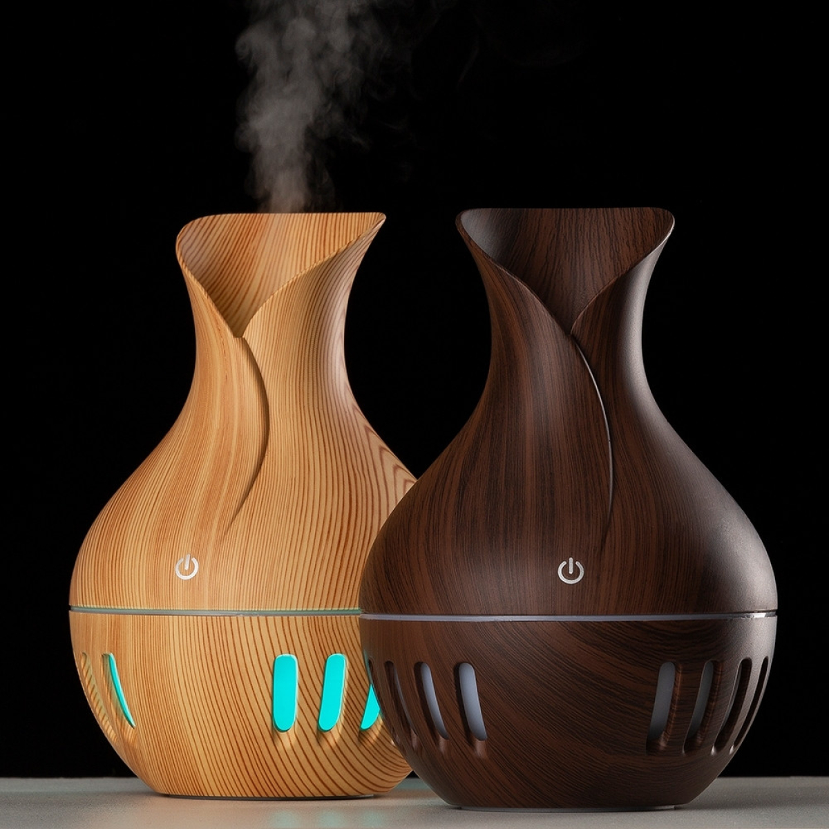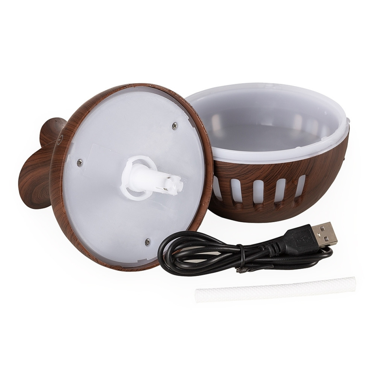 Descrição: Umidificador ultrassônico com show de luzes em led. Produzido em material plástico com estilização similar a madeira, o umidificador possuí capacidade de até 130ml e funciona apenas a base de água. O produto não armazena carga, a sua utilização só pode ser feita com cabo USB. Taxa de consumo de