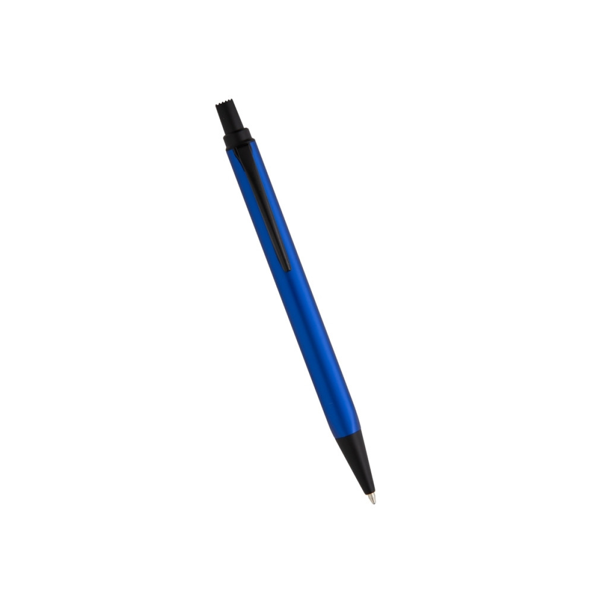 Descrição: Caneta metálica triangular com carga esferográfica azul e acionamento por clique.