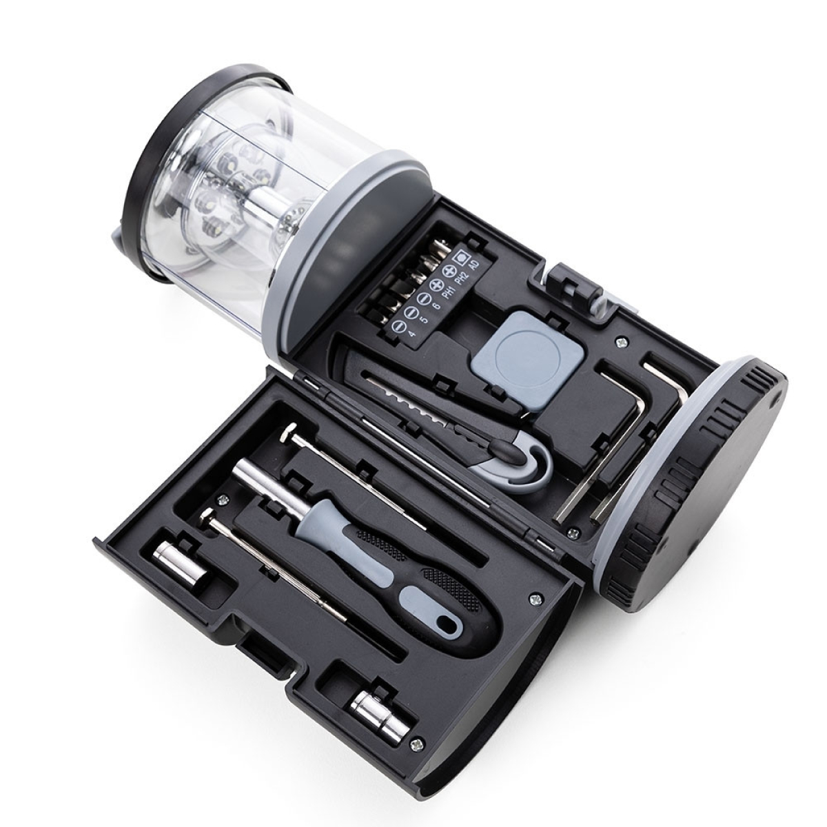 Descrição: Lanterna LED com Kit Ferramentas 15 peças, o kit contém: Mini chave de fenda, Mini chave philips, Cabo emborrachado para encaixe de ponta de chave de fenda e chave philips, 3 pontas de chave de fenda, 2 pontas de chave philips, 2 chaves hexagonais em L, 2 soquetes de chave hexagonal, Trena de 1 metro, Estilete e Extensor para soquete de chave hexagonal.