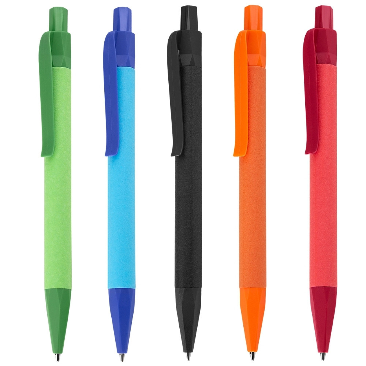 Descrição: Caneta de papel reciclado com detalhes plásticos, carga esferográfica azul e acionamento por clique.