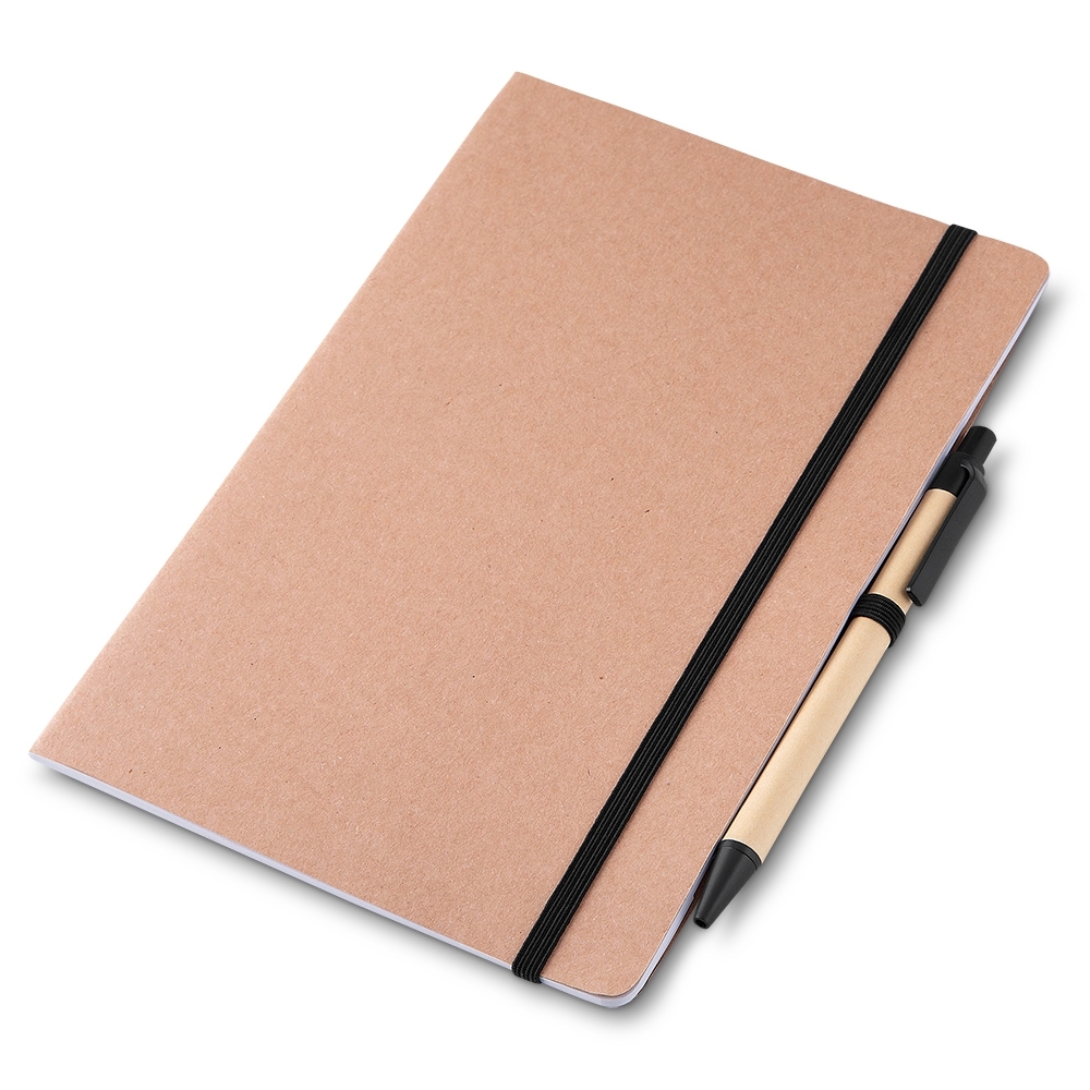 Descrição: Bloco de anotações ecológico com caneta de papel: Bloco de anotações com elástico e suporte para caneta, aproximadamente 30 folhas brancas com pauta, caneta com acionamento por clique.