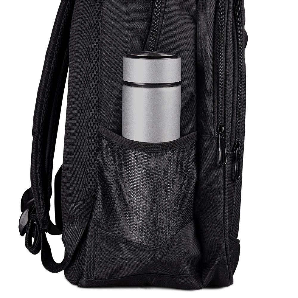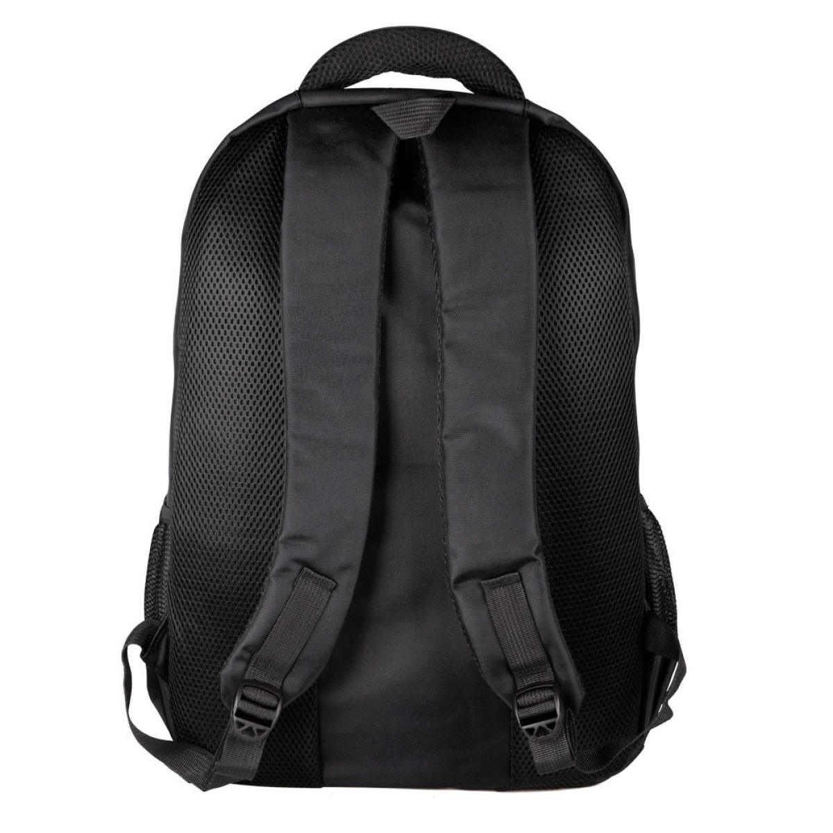 Descrição: Mochila confeccionada em poliéster com compartimento para notebook. Contém compartimento grande com bolso para notebook até 17 polegadas, compartimento mediano com zíper, compartimento pequeno com zíper bolso frontal com zíper, alça de mão, alça superior em nylon, alças de ombro e costas acolchoada com revestimento antitranspirante e bolsos laterais telados.