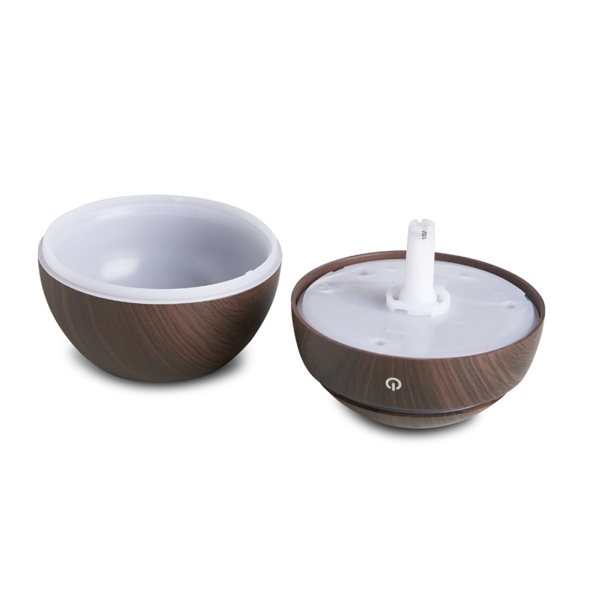 Descrição: Mini umidificador ultrassônico com led que muda de cor. Acompanha filtro de algodão e um cabo USB. Capacidade para 130ml de água. Produzido em plástico e revestido por adesivo caracterizando madeira. Taxa de tensão DC5V e Taxa de consumo de 2W. O produto não retém energia, funciona somente com o cabo USB conectado a um meio de alimentação de energia. Obs.: para conservação do produto é recomendável utilizar água filtrada e não deve ser usado essências!