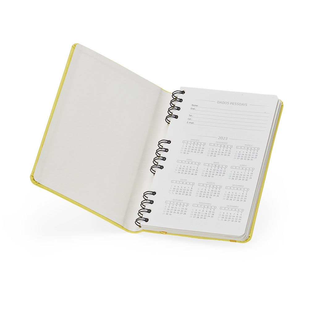 Descrição: Caderneta emborrachada com wire-o, elástico para lacre e marcador de página em cetim. Possui páginas para dados pessoais, calendário de 2022 à 2024, página de contatos e aproximadamente 100 páginas em marfim com pauta.