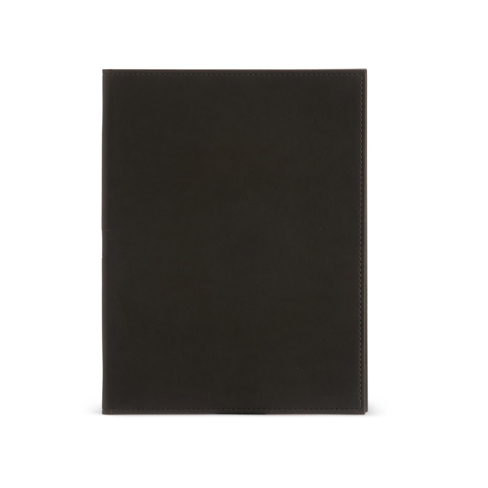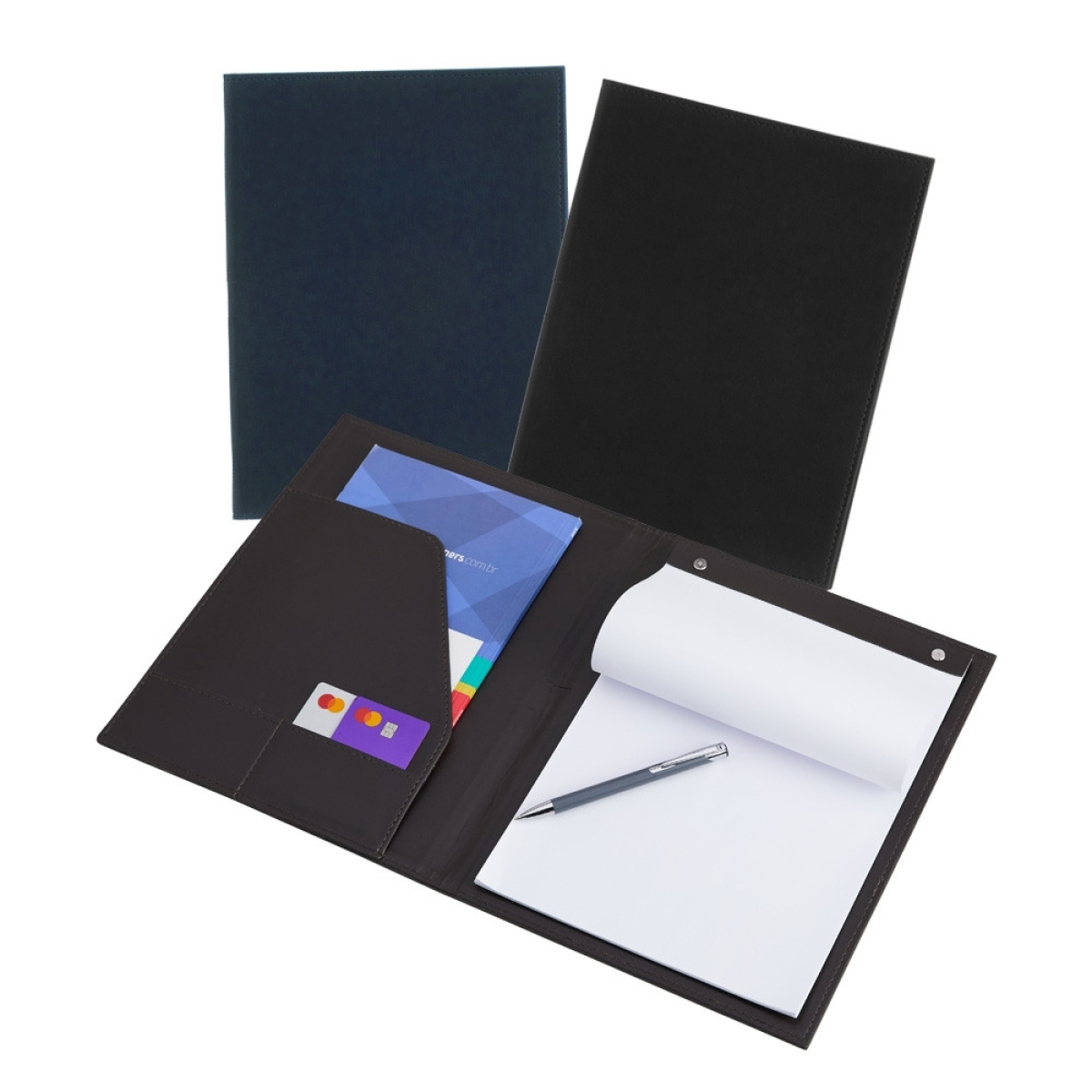 Descrição: Pasta convenção de couro sintético, possui porta caneta, compartimento para arquivar documentos, dois bolsos para cartões e um bloco com aproximadamente 25 folhas brancas não pautadas.