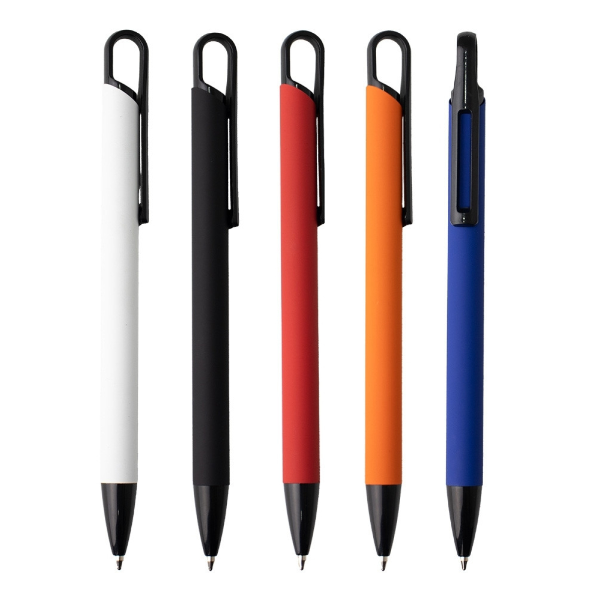 Descrição: Caneta semimetálica com acabamento emborrachado, acionamento por clique e carga esferográfica azul 1.0mm.