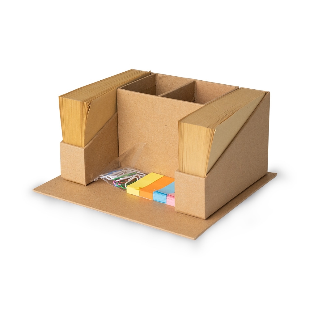 Descrição: Bloco de anotações ecológico com porta canetas e autoadesivos. Possui dois compartimentos para canetas, réguas e pequenos objetos. Inclui dois blocos de papel kraft com aproximadamente 250 folhas cada, um pacote com cerca de 16 clipes coloridos e quatro blocos de marcadores de páginas coloridos, cada um com aproximadamente 60 folhas.