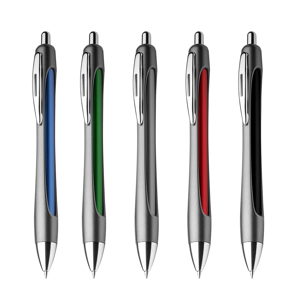 Descrição: Caneta em alumínio reciclado com carga esferográfica azul 1.0 mm e acionamento por clique.