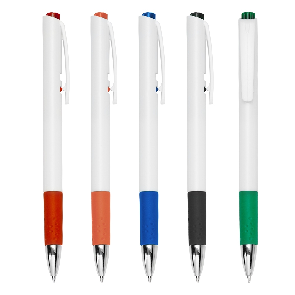 Descrição: Caneta plástica com detalhe emborrachado, carga esferográfica azul e acionamento por clique.