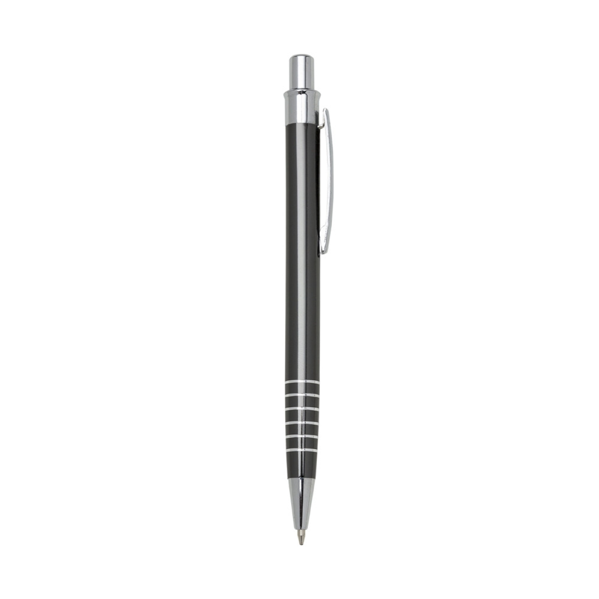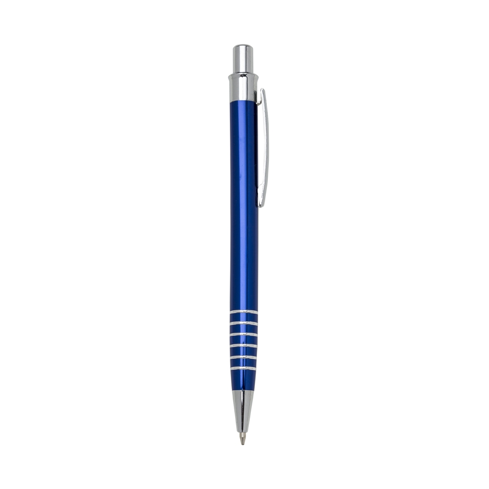 Descrição: Caneta metálica com carga esferográfica azul e acionamento por clique.