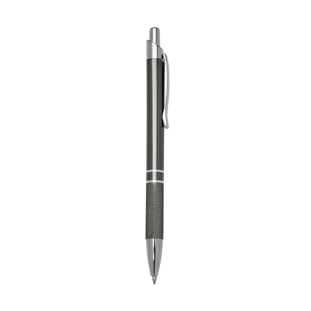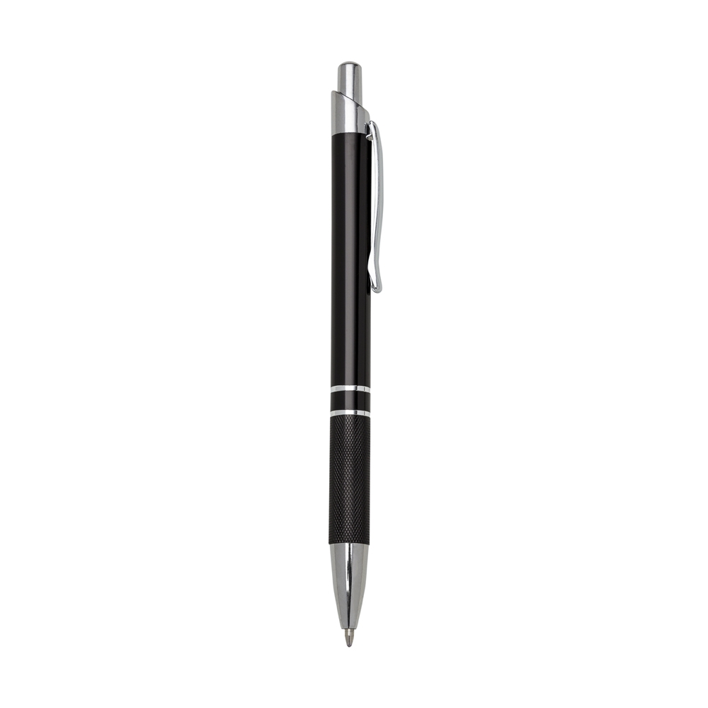 Descrição: Caneta metálica com carga esferográfica azul e acionamento por clique.