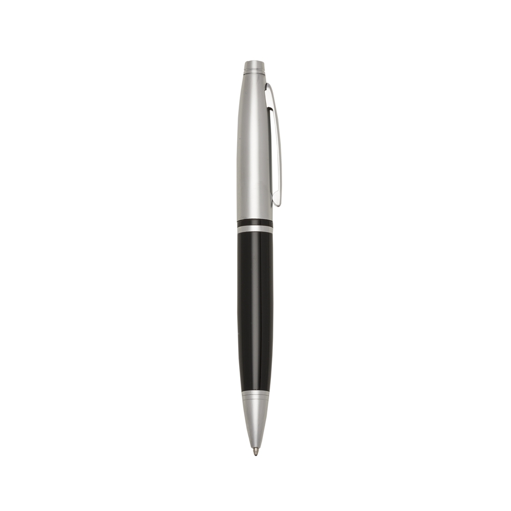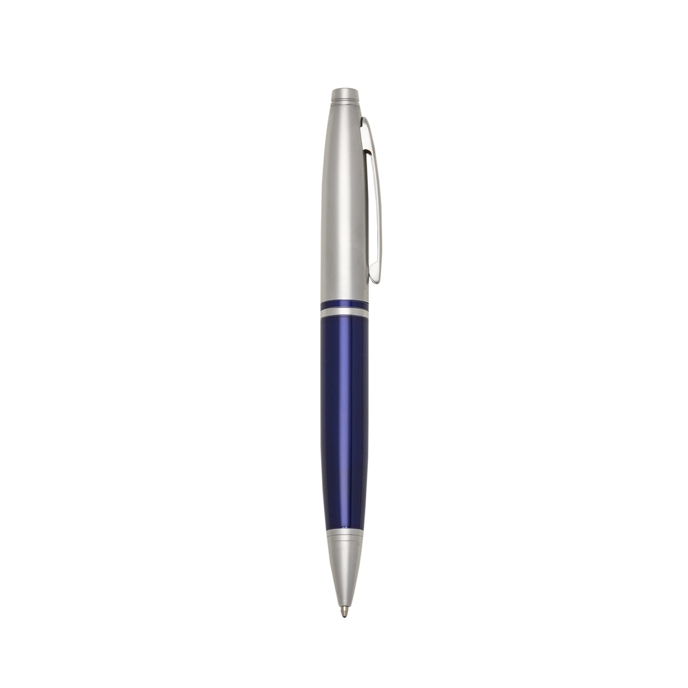 Descrição: Caneta metálica com carga esferográfica azul e acionamento por rotação.
