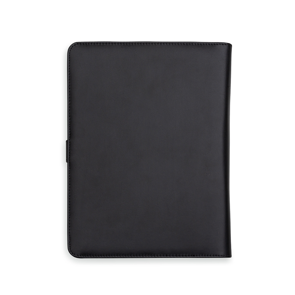 Descrição: Pasta convenção com fecho imantado e plaquinha personalizável. Produzido em couro sintético, a pasta contém bolso lateral na contracapa e bolso com fechamento em zíper, além divisórias para cartões e/ou documentos com bolso lateral. Possui acesso para fichário de duas argolas e compartimento para bloco de folhas com aproximadamente 20 folhas brancas com pauta.
