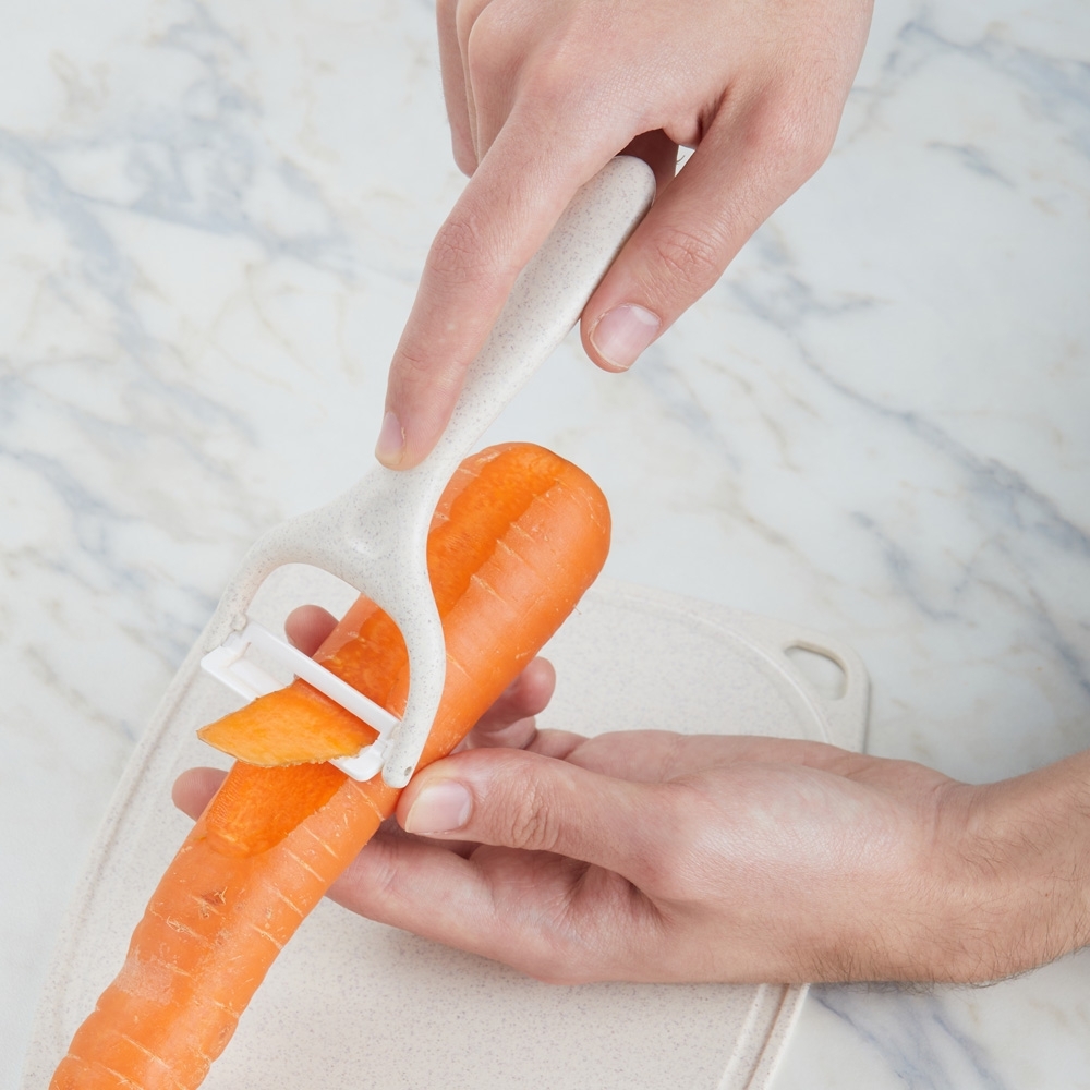 Descrição: Kit Cozinha 3 Peças em plástico de palha de trigo e inox. Contém tesoura culinária, faca com protetor e descascador de legumes. Acompanha bandeja e tampa, podendo ser utilizada como recipiente e tábua para corte.
