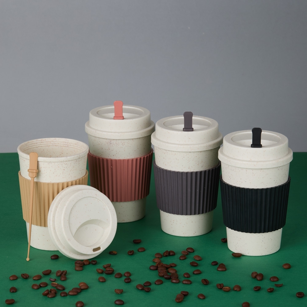 Descrição: Copo Fibra de Trigo 450ml com tampa rosqueável. Acompanha mexedor e manga protetora antiderrapante.