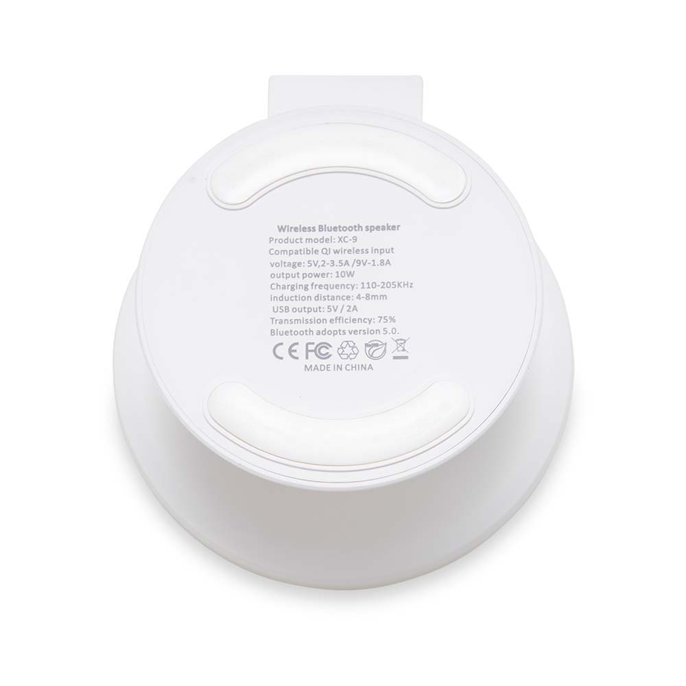 Descrição: Caixinha de Som bluetooth com carregador por indução. Produzido em material plástico, a caixinha possui antiderrapantes emborrachados na parte inferior, ao ser inclinado o produto também pode ser utilizado como suporte para o celular. Para desfrutar do carregamento por indução (sem fio) é fundamental que o celular possua a tecnologia QI – desta maneira é possível carregar o celular posicionando-o sob carregador, sendo necessário apenas conectar o carregador à uma fonte de energia (USB ou diretamente na tomada). Acompanha cabo USB Tipo-C.