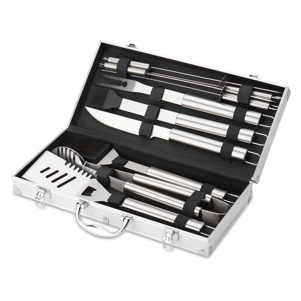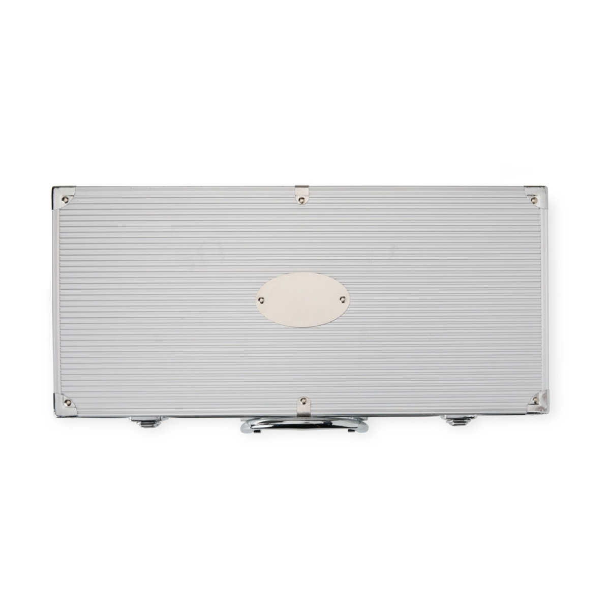 Descrição: Kit churrasco 10 peças em maleta de alumínio com travas de segurança e placa central para personalização. Contém: espátula, pegador, escova para grelha, faca, pincel, garfo e quatro espetos, parte interna da maleta com revestimento em TNT e suportes de velcro para fixação das peças.