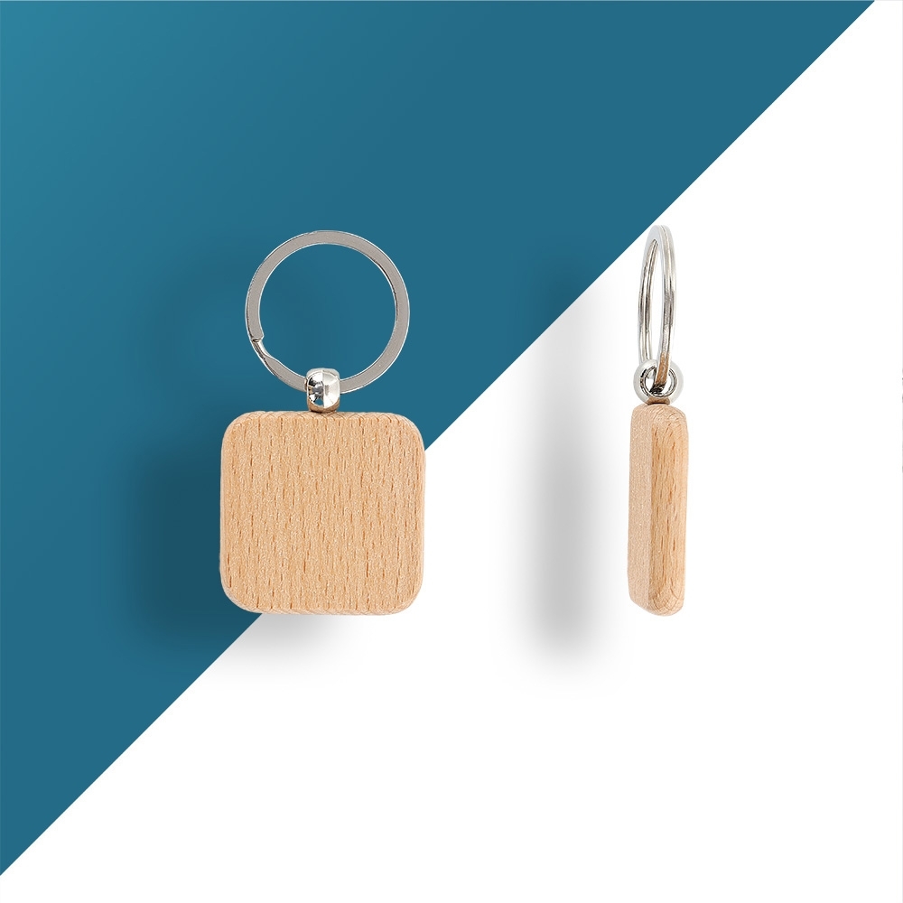 Descrição: Chaveiro em madeira com formato quadrado.