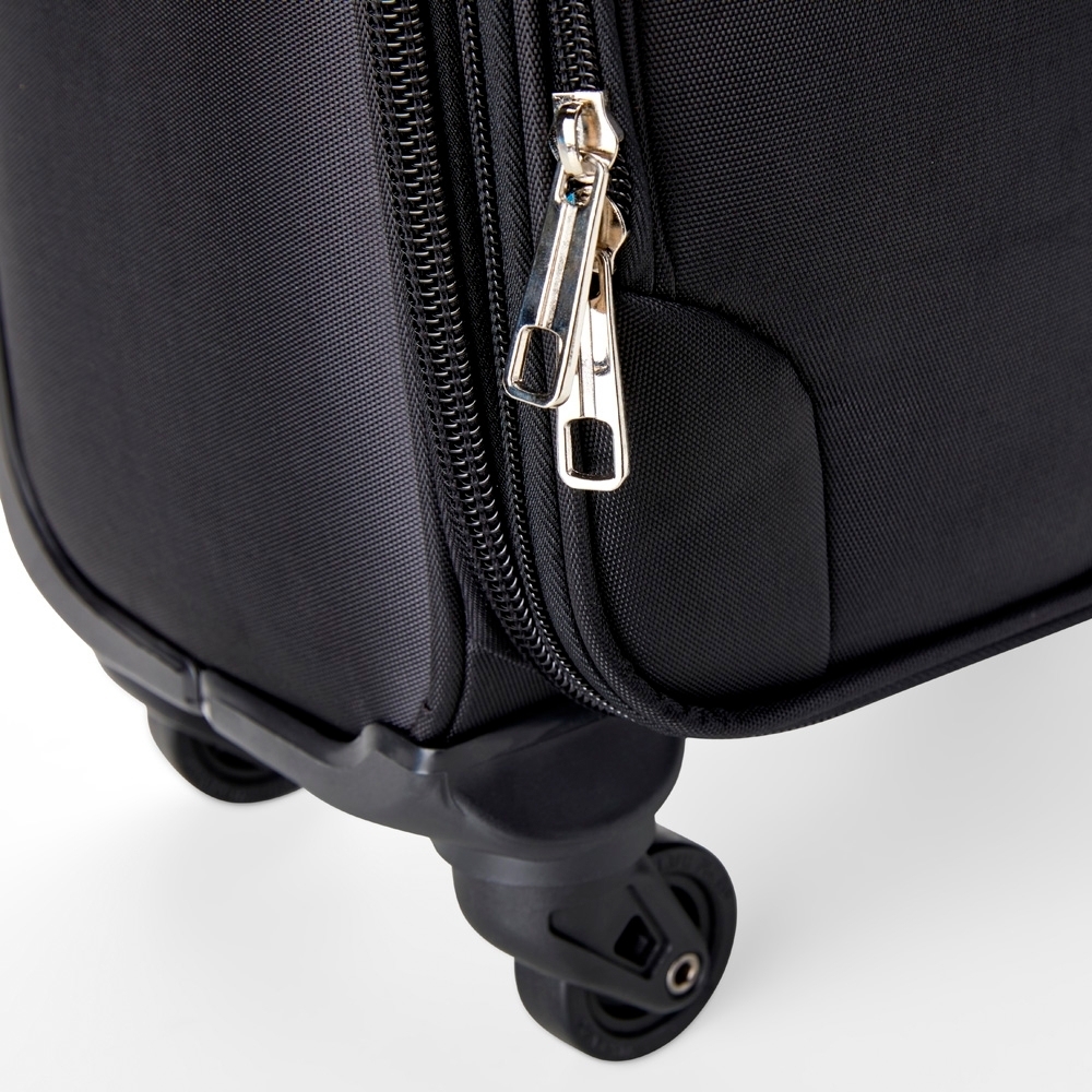 Descrição: Mala de bordo 47 Litros com padrão ANAC (Agência Nacional de Aviação Civil), confeccionada em poliéster de alta qualidade, com cadeado numérico TSA. Possui etiquetas de identificação embutidas na mala, sendo uma integrada ao cadeado e outra na parte de trás da mala, acoplada por estojo em couro sintético. Três compartimentos, bolso telado, cinta compressora para roupas, alça de mão em poliéster, puxador retrátil com regulagem de tamanho e quatro rodinhas 360º.