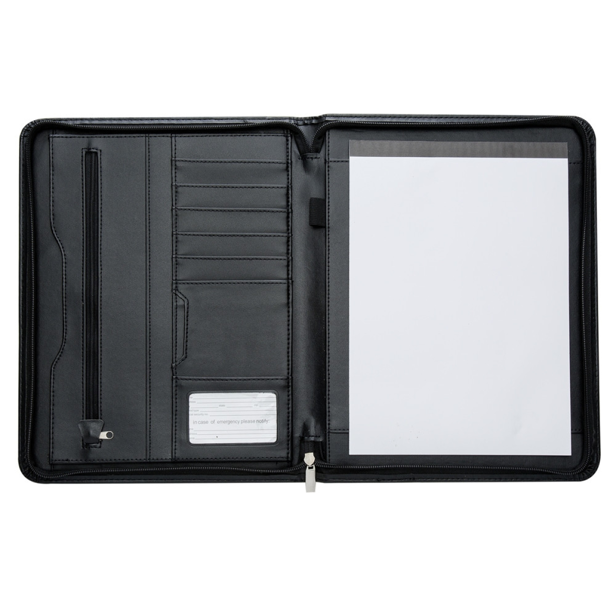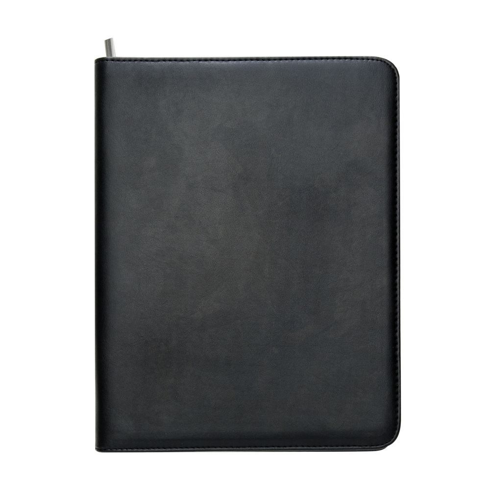 Descrição: Pasta convenção de couro sintético com zíper, possui 2 compartimentos grandes para arquivar documentos, compartimento interno com zíper, 7 divisórias pequenas para documentos, suporte com visor para cartão de identificação, suporte para caneta(não acompanha caneta) e bloco com 20 folhas pautadas.