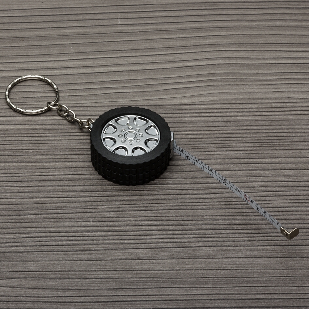 Descrição: Chaveiro trena 1 metro formato pneu brilhante, material emborrachado com relevo. Detalhes do aro em plástico prata, verso liso. Trena não possui trava.