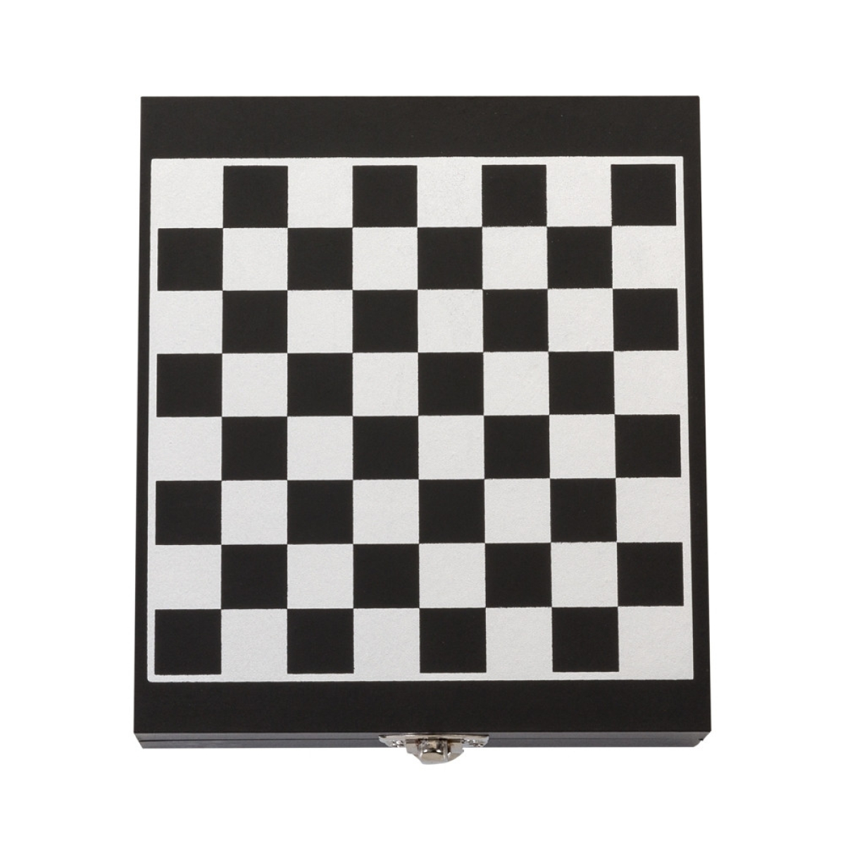 Descrição: Kit vinho 4 peças em estojo tabuleiro de xadrez. Contém wine collar, tampa de bico, bico condutor com tampa e saca-rolhas metálico com lâmina de corte e abridor de garrafa. Estojo com trava de segurança e área interna com berço de espuma, acompanham 32 peças de xadrez e plaquinha metálica para personalização.