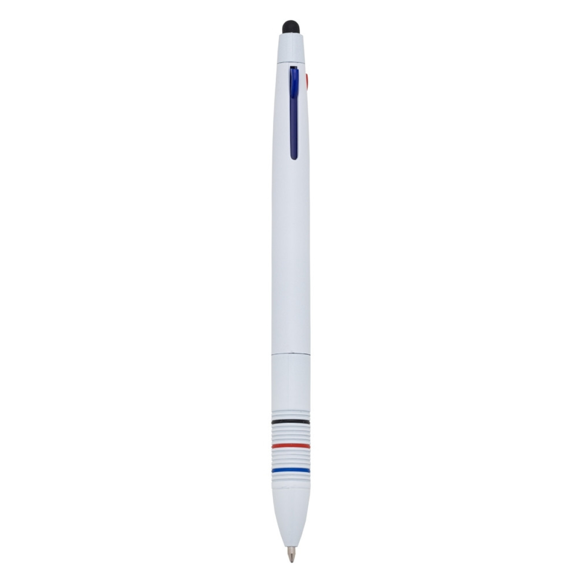Descrição: Caneta plástica 3 em 1 com touch screen, cargas esferográficas nas cores: azul, preto e vermelho.