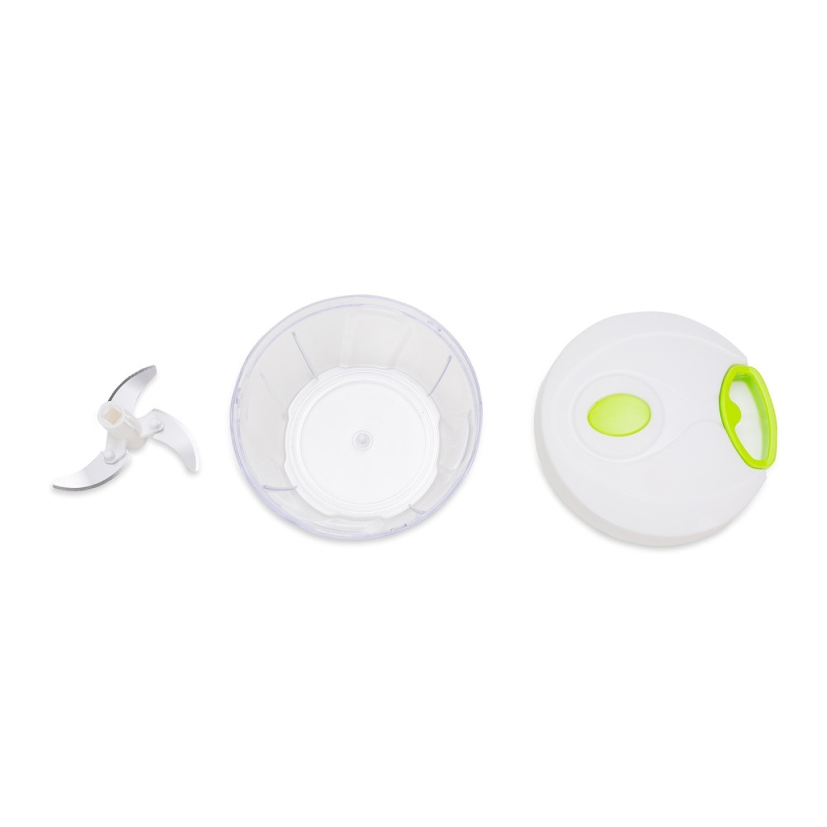 Descrição: Processador de alimentos manual, tampa plástica de polipropileno com puxador verde, pote transparente em poliestireno com relevo e lâminas em aço inox.